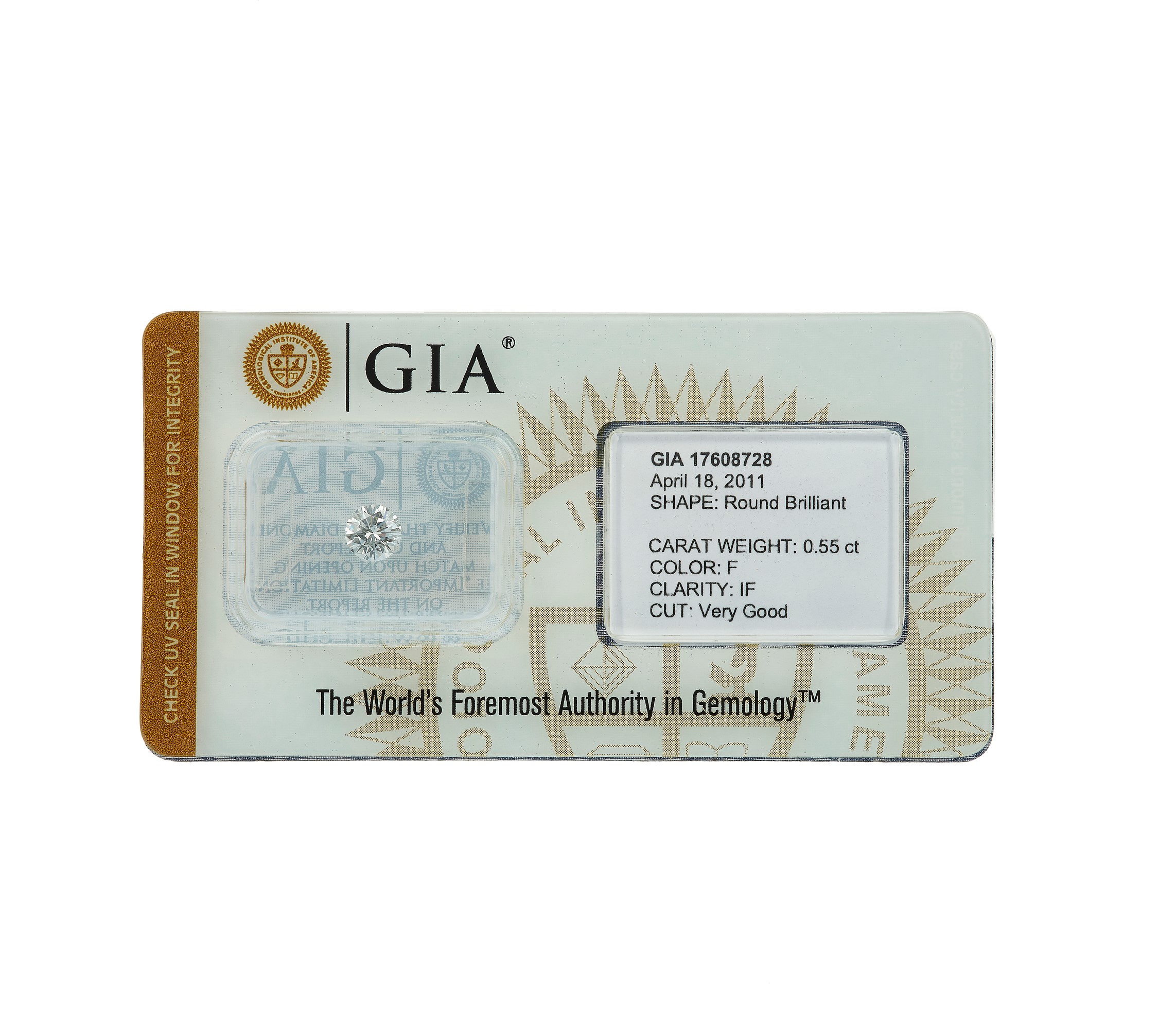 Brilliant-cut diamond weighing 0.55 carats, color F, clarity IF, fluorescence none. Gemmological Report GIA n. 17608728