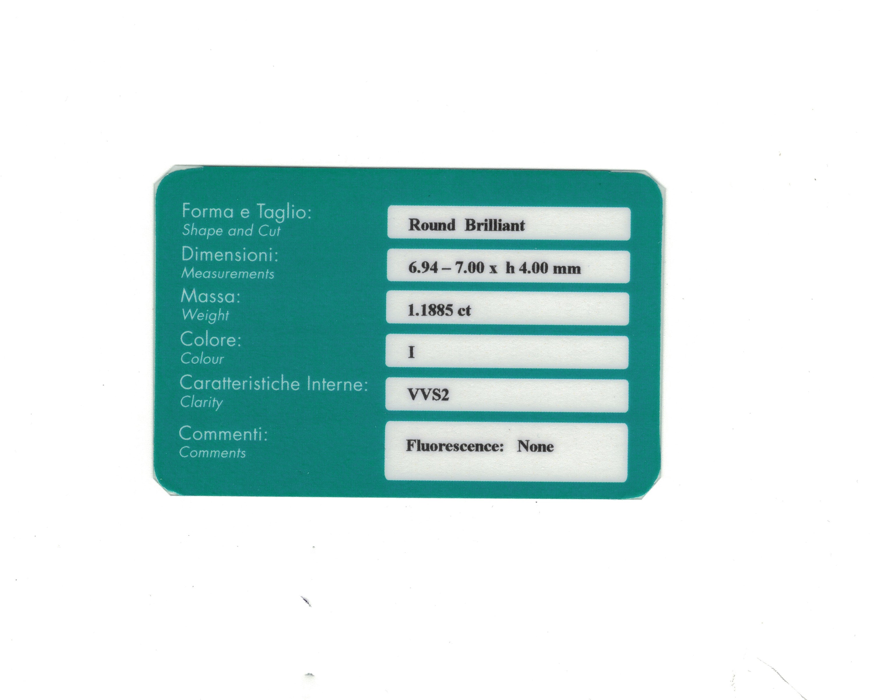 Brilliant-cut diamond weighing 1.1885 carats, color I, clarity VVS2, fluorescence none. Gemmological Report R.A.G. Torino n. DV24054