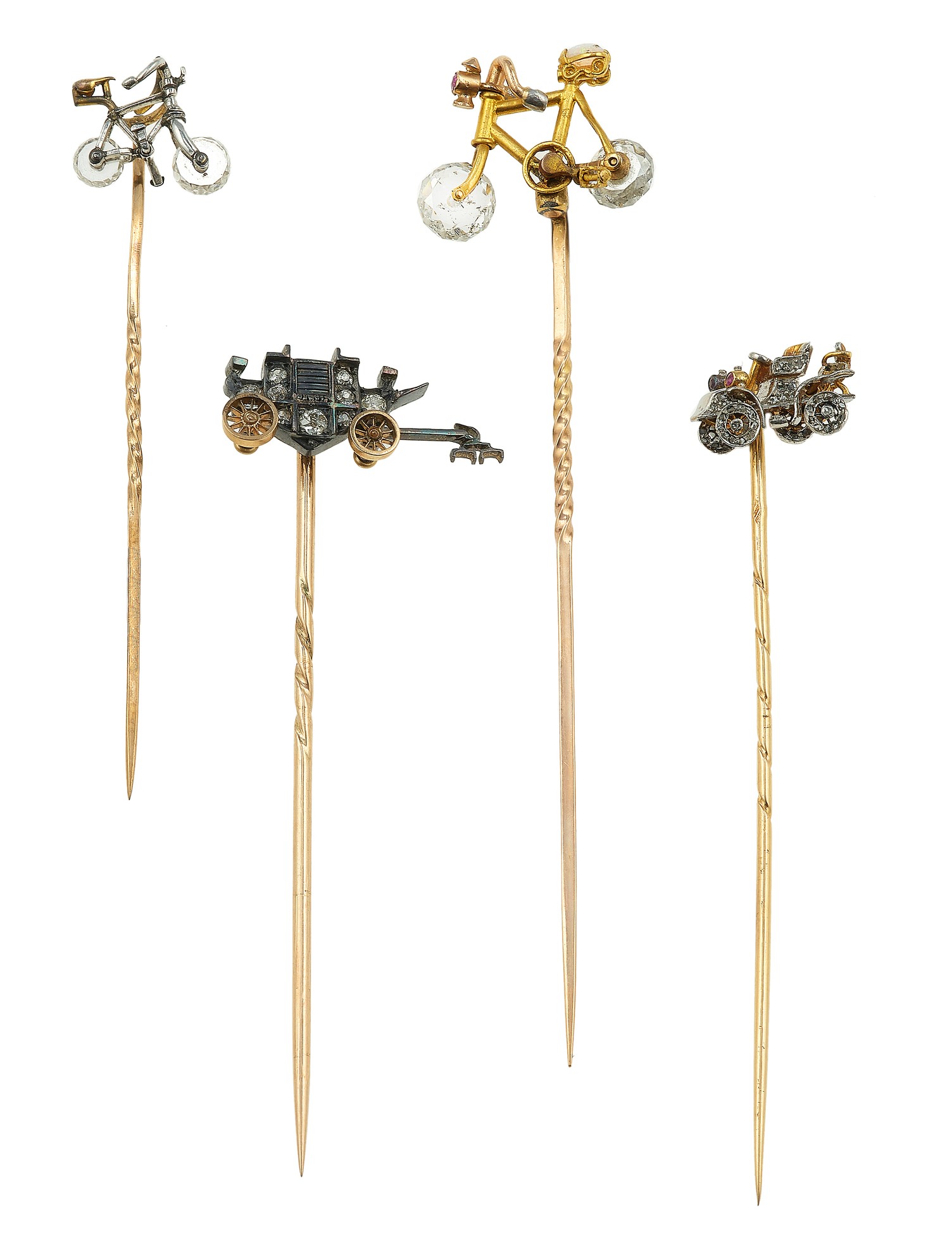 Collection of four gold, silver, diamond, flat-cut diamond and rock crystal pins