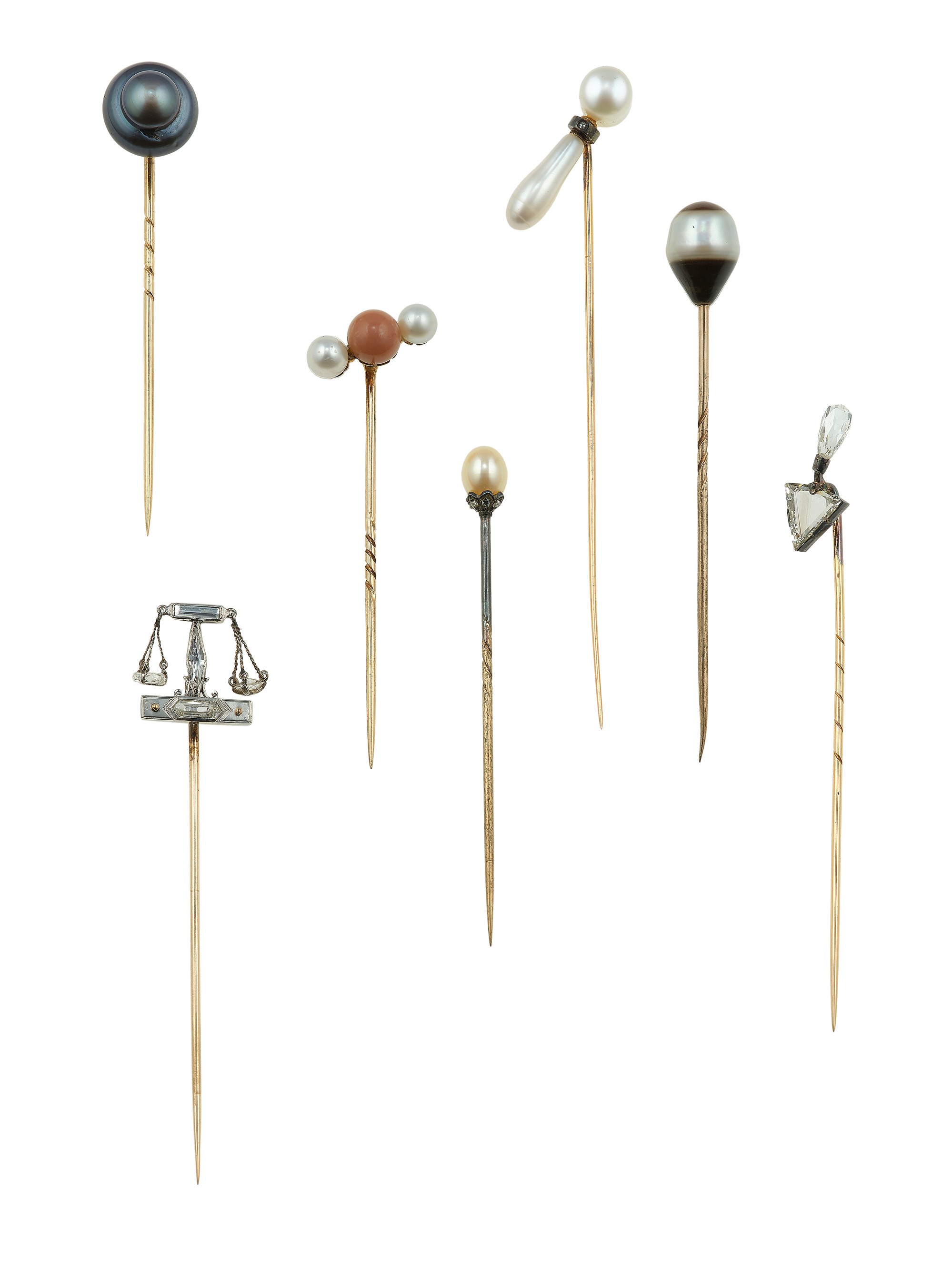 Collection of seven gold, silver, pearl, flat-cut diamond and rock crystal pins