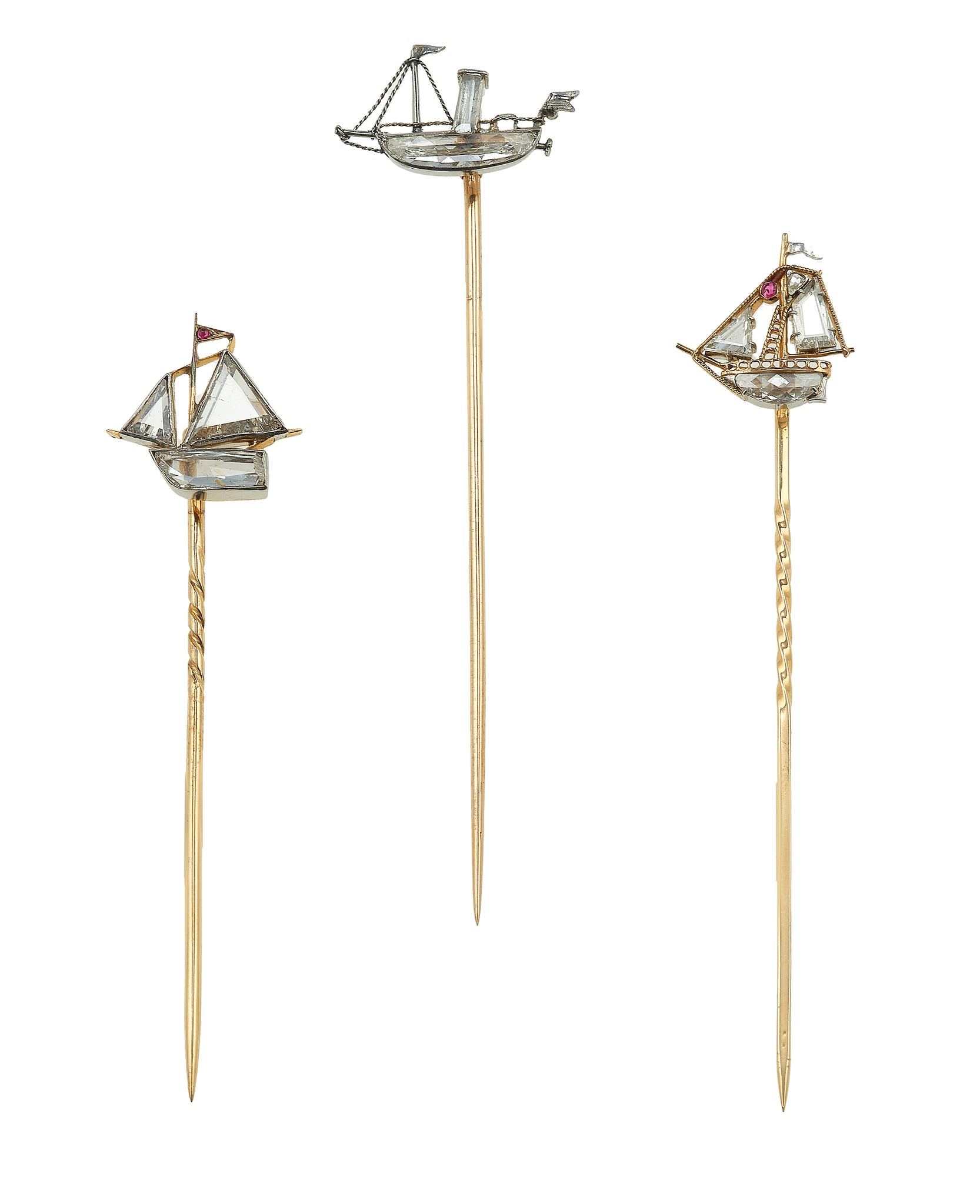 Collection of three gold, silver, diamond, flat-cut diamond and rock crystal pins