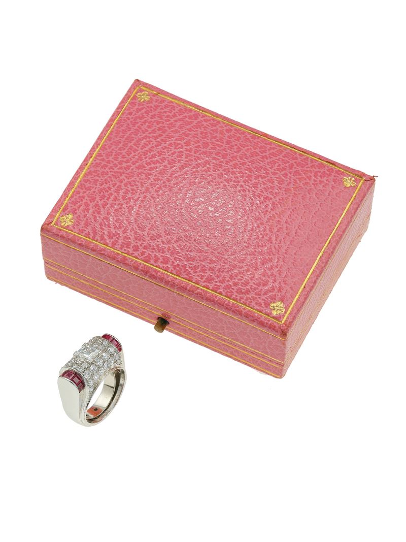 Diamond, ruby and platinum ring. Case stamped Ventrella, Roma
