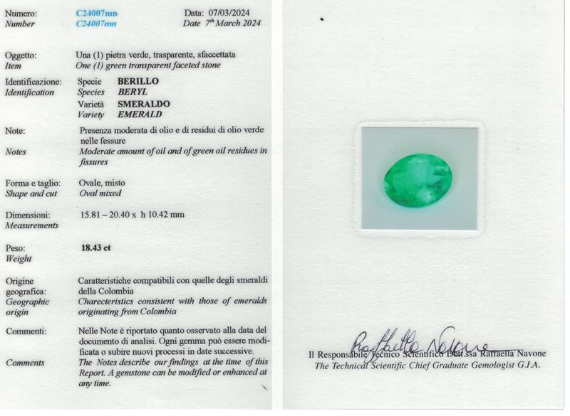 Emerald and diamond ring. Gemmological Report R.A.G. Torino n. C24007mn