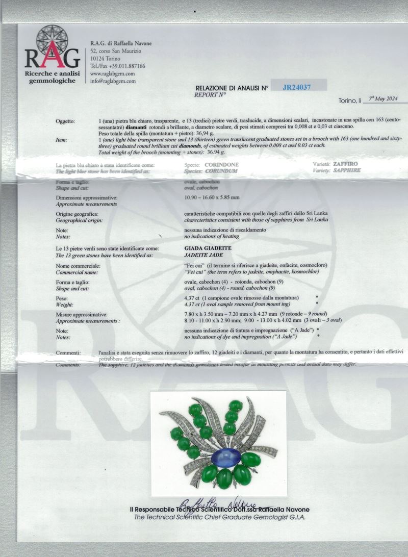 Jadeite jade, sapphire, diamond and platinum brooch. Gemmological Report R.A.G. Torino n. JR24037