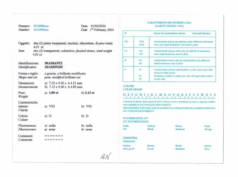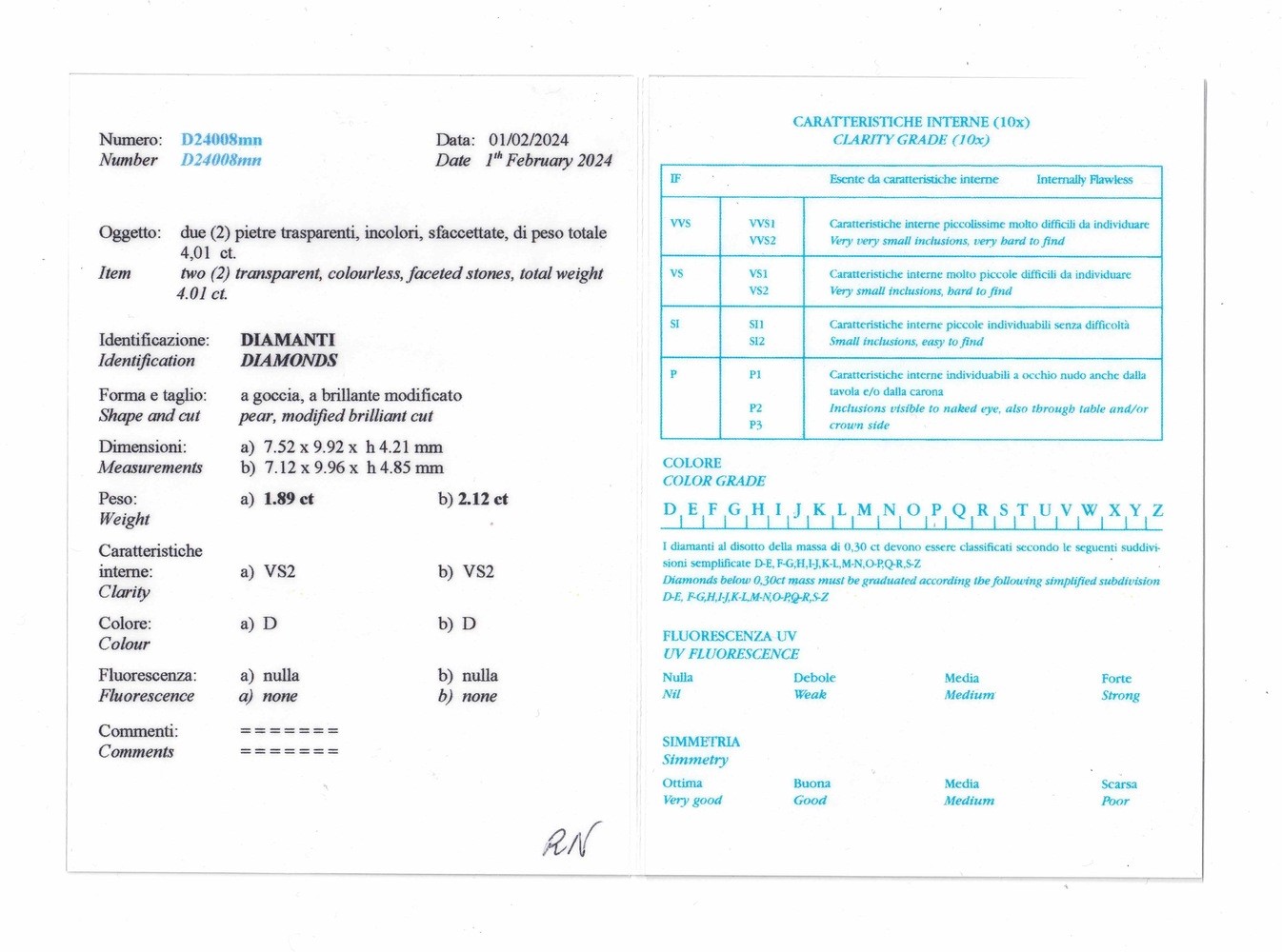 Pair of drop cut diamond and platinum earrings. Drop cut diamonds weighing 1.89 carats and 2.12 carats, color D. Gemmological Report R.A.G. Torino n. D24008mn