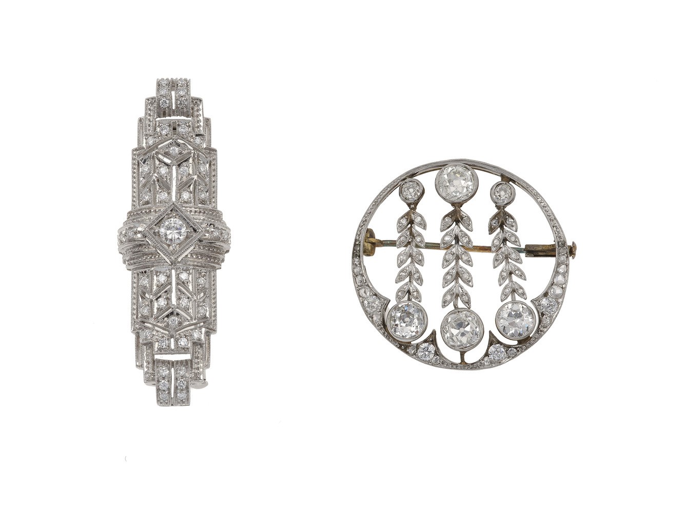 Two diamond, platinum and gold brooches