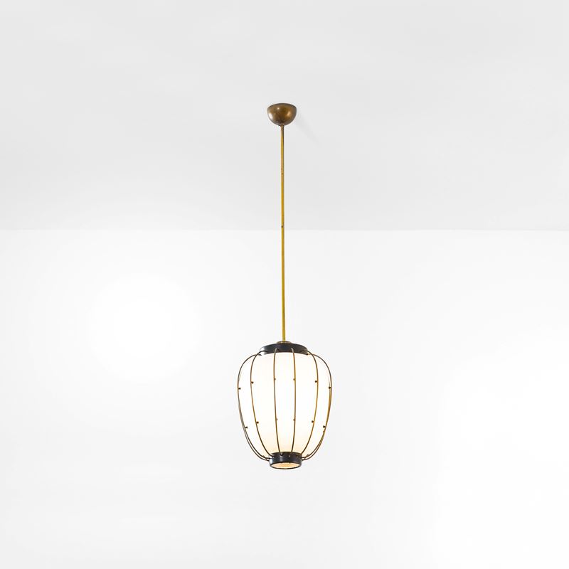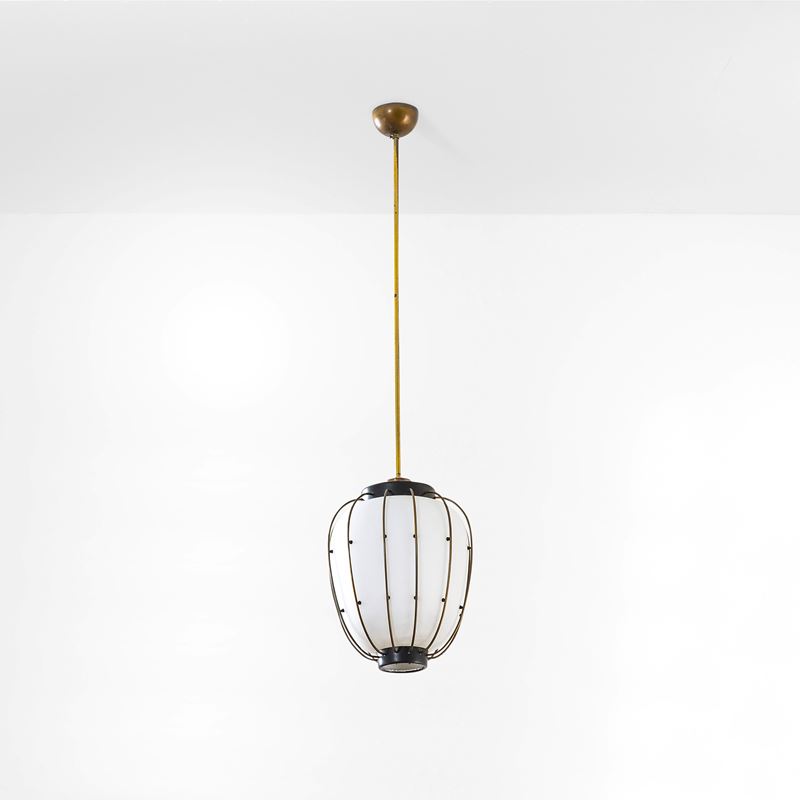 Struttura in metallo e ottone con diffusore interno in vetro opalino.