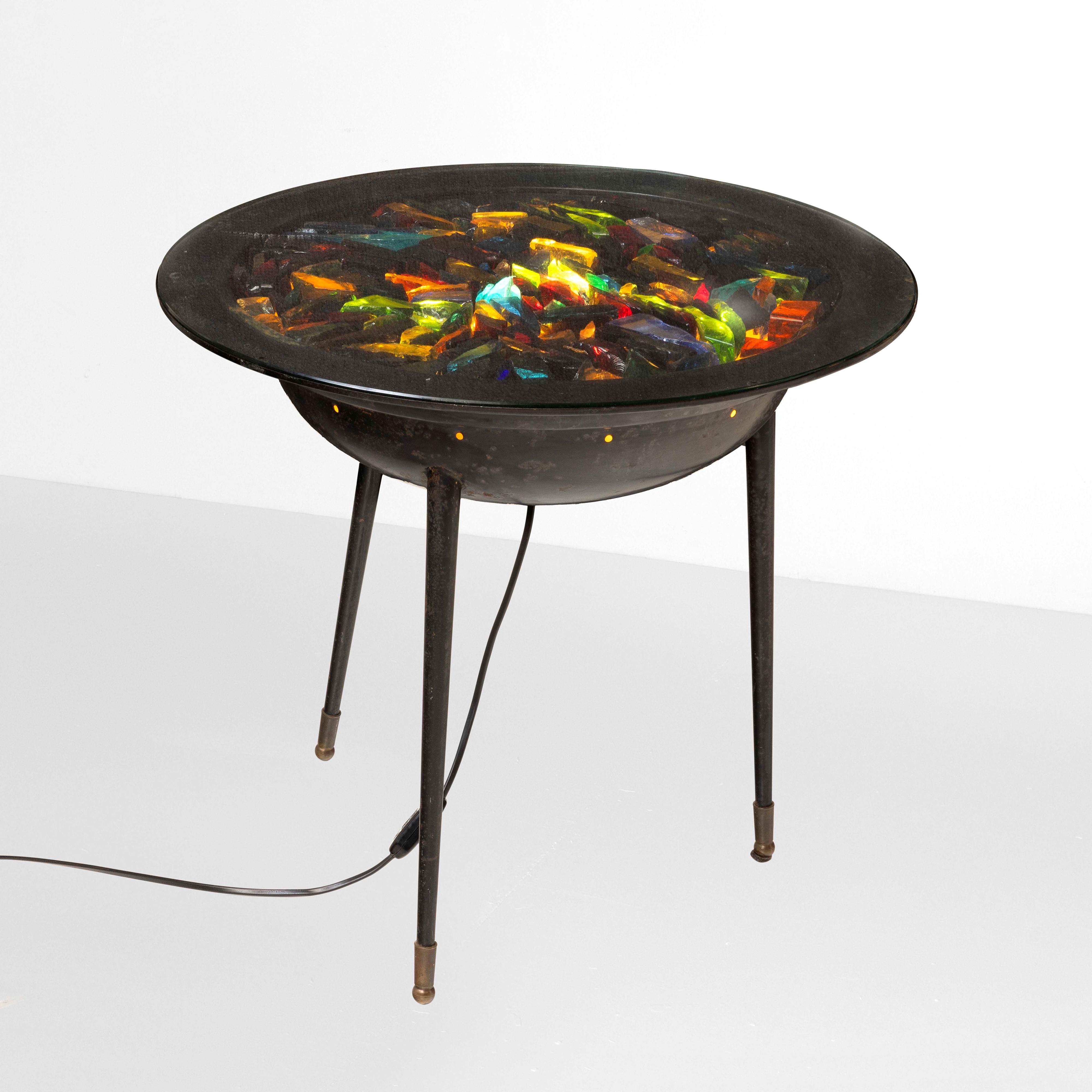 Struttura in metallo laccato con piano in vetro policromo retroilluminato.