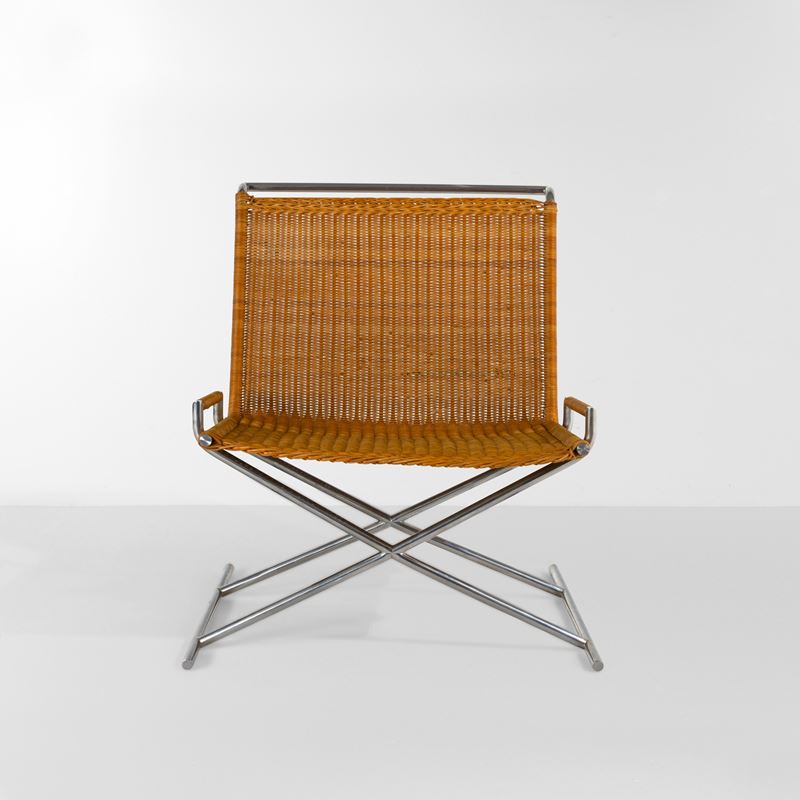 Struttura in tubolare metallico e seduta in rattan.
