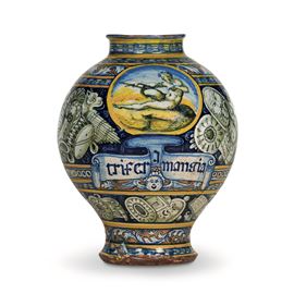 Si tratta di una tipica “boccia” da farmacia di corposa foggia globulare, piccolo piede leggermente svasato e bocca di quasi ugual diametro, con basso colletto cilindrico e orlo estroflesso. Sulla zona frontale campeggia un medaglione ovale nel quale è racchiusa la figura ignuda di un uomo sdraiato, che con la destra stringe un remo, chiara allegoria del fiume (Tiberinus Pater?). Sotto il medaglione è dipinto orizzontalmente un cartiglio dall’andamento sinuoso, su cui è tracciata la legenda farmaceutica in carattere gotico “trifera mangia” (“trifera magna”), medicamento che nel ‘500 era prescritto per i dolori di stomaco. Sulla restante superficie si dispongono dei “trofei larghi” basati principalmente su armi antiche, anche se non mancano altri elementi tra i quali una viella, un liuto, fogli rilegati con pseudo scrittura e un cartiglio su cui si leggono le iniziali “S” e “F”. La veste decorativa si completa di alcune fasce sul colletto, sulla spalla e verso la zona inferiore, composte da un festone e da un tralcio continuo di foglie di acanto. Dipinto in arancio, blu, mezza tinta grigiastra, giallo e verde