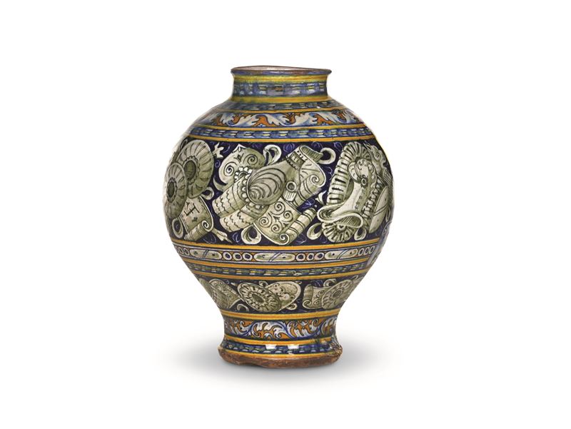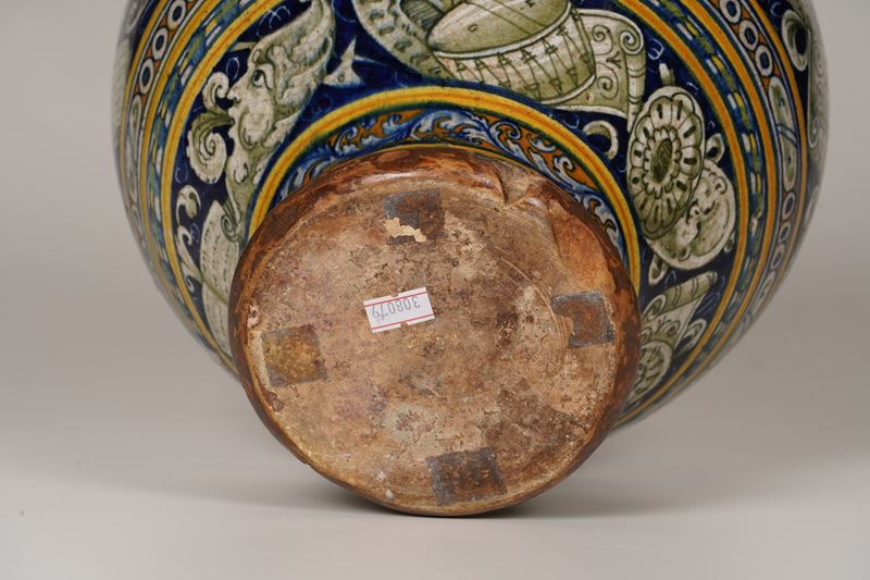 Maiolica. Altezza cm 31. Conservazione: collo ricomposto e base con bordo ripreso in restauro con minime mancanze di smalto
