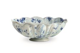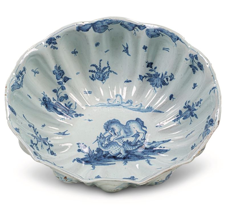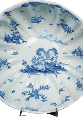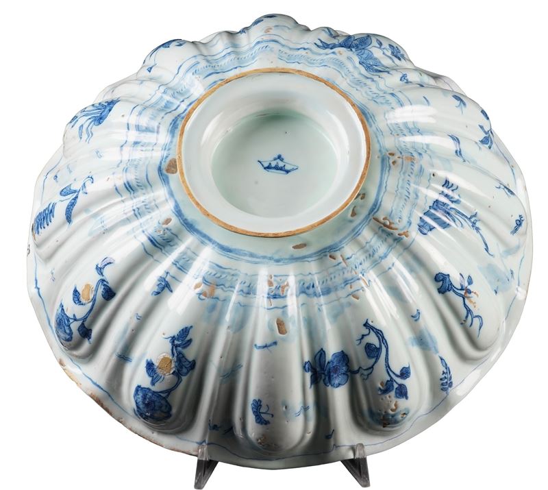 Maiolica. Marca: corona in blu. Dimensioni: altezza cm 13 circa; diametro cm 34,5 Conservazione: piede restaurato e piccole riprese al bordo superiore.