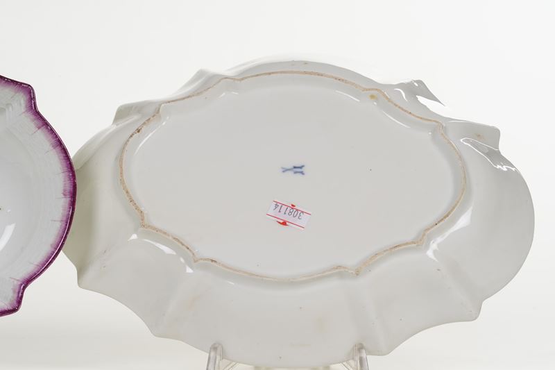 Piatti ovali dalla tesa fortemente rialzata e mistilinea con il rilievo detto “Altbrandenstein” e bordo dipinto a pettine in rosso porpora. La decorazione policroma vede bouquet e ramoscelli fioriti sparsi. Questi fiori detti “Manierblumen”, ossia fiori copiati con tratto rapido direttamente dalla natura, sono utilizzati a Meissen a partire dalla metà del Settecento