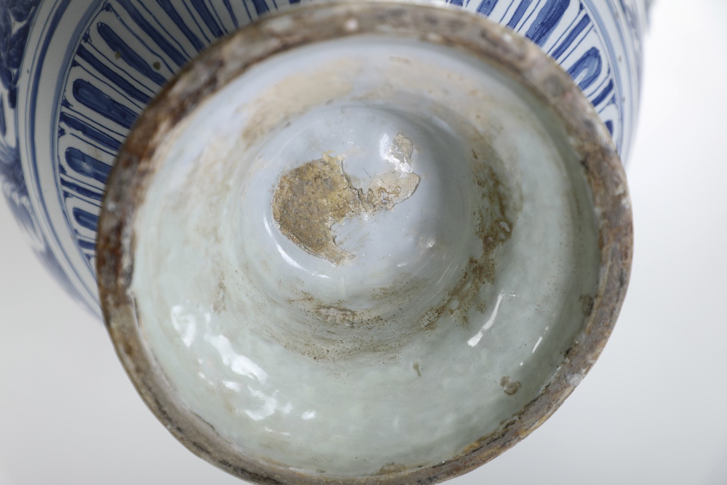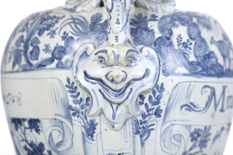 La sontuosa decorazione, monocroma blu su fondo “berettino”, oltre lo stemma e il fregio di elementi geometrici, comprende il soggetto istoriato sulla superficie anteriore. L’episodio sembra riferirsi alle missioni dei Gesuiti nell’estremo oriente, lo suggerisce la cornice ambientale, concepita in uno stile prossimo al “calligrafico naturalistico” ligure, ornato esteso all’intera superficie vasale.