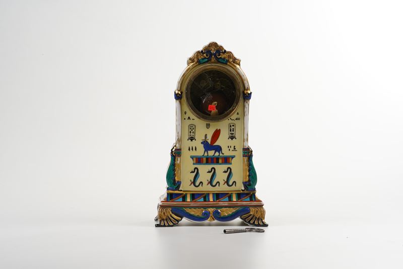 Dalla base, su piedini a foglia di acanto stilizzate, sorge l’orologio modellato a semplice architettura decorata con rilievi che si sprigionano sempre dalle foglie di acanto. La decorazione pittorica, a vivace policromia e oro su fondo giallo tenue, è a raffigurazioni ispirate al “retour d’Egypte” ed ai geroglifici che diventano elemento decorativo.