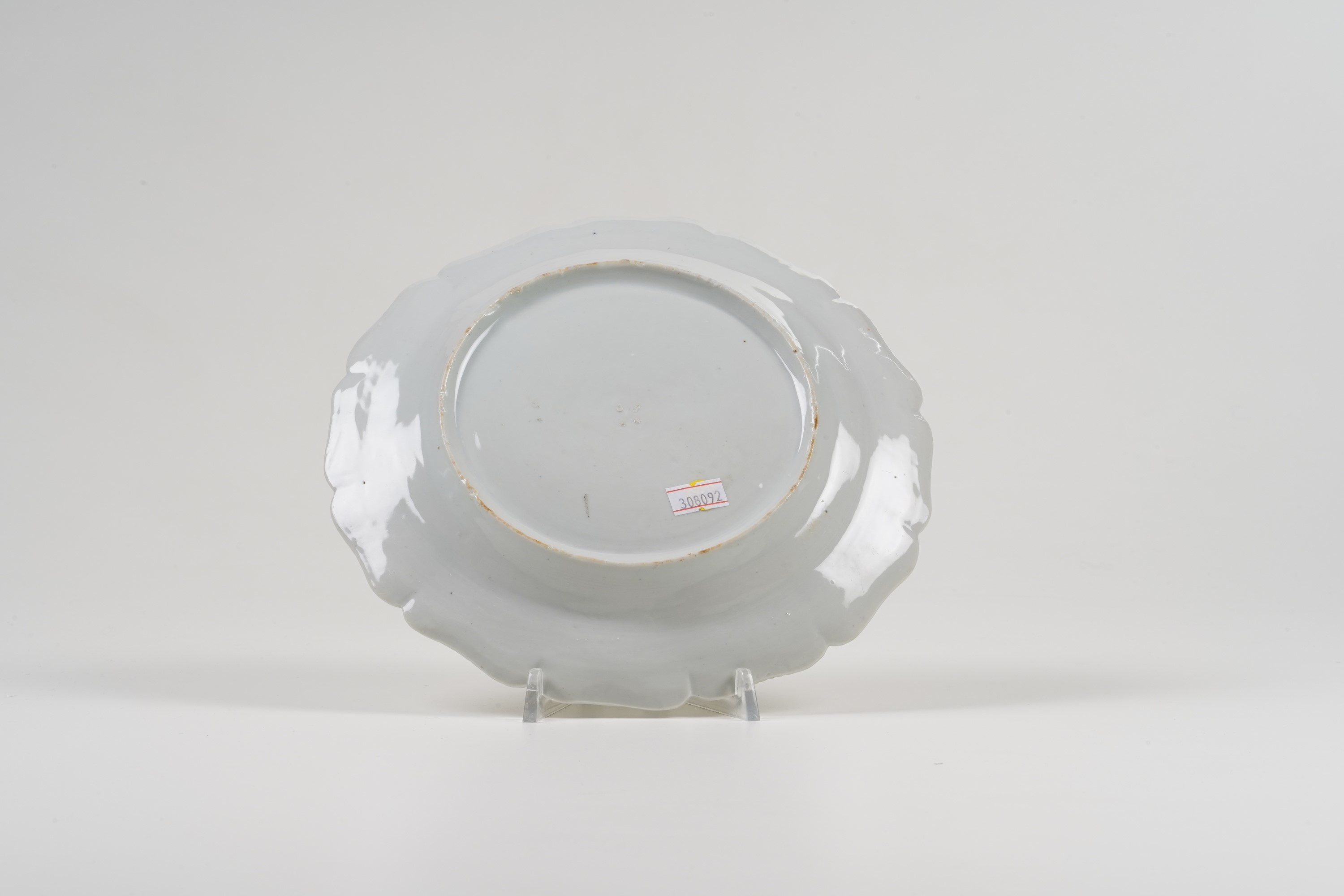 Il piatto ha una forma circolare intervallata da lobi arcuati. Sulla tesa presenta un motivo a “paniere intrecciato” o “Alt-Ozier”, ispirato all’invenzione del 1733 del modellatore Johann Joachim Kändler per la Manifattura di Meissen, sorta per prima in Europa nel 1710.