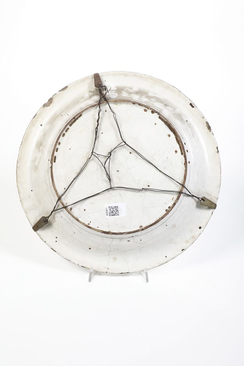 Maiolica. Diametro cm 40,5. Conservazione: una felatura; crettature; qualche salto di smalto ai bordi.