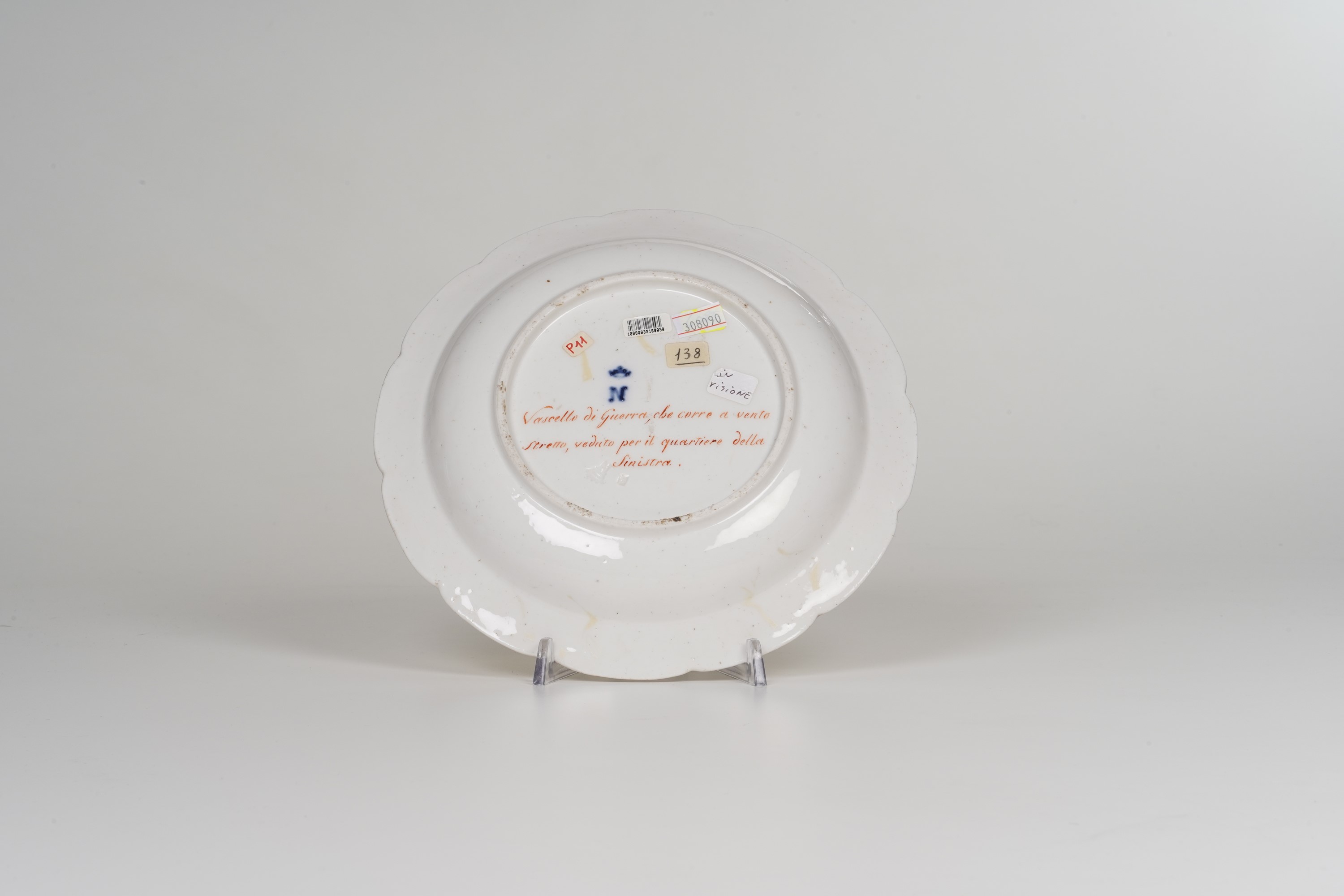 Il nostro piatto - pubblicato da A.Caròla-Perrotti, Le Porcellane dei Borbone di Napoli, Capodimonte e Real Fabbrica Ferdinandea, 1743-1806, Napoli 1986, tav. LXXV - riporta sul verso la scritta in rosso ferro “Vascello di Guerra, che corre a vento stretto, veduto per il quartiere della sinistra”.