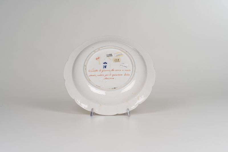 Porcellana policroma e dorata. Marca: “N” con corona, in blu; “N” con corona impressa. Diametro cm 22,6. Conservazione: usure all’oro del bordo.