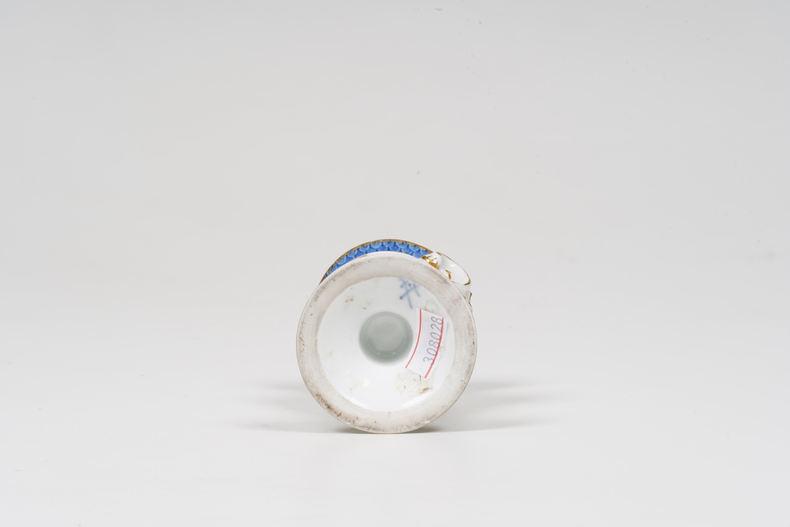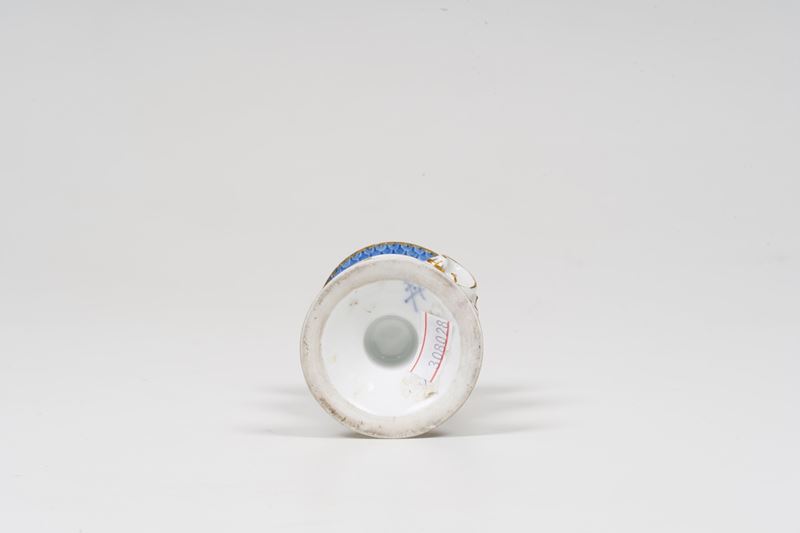 Porcellana. Marca: spade con punto tra le else, in blu. Altezza cm 10. Conservazione: piccola seccatura al bordo superiore.