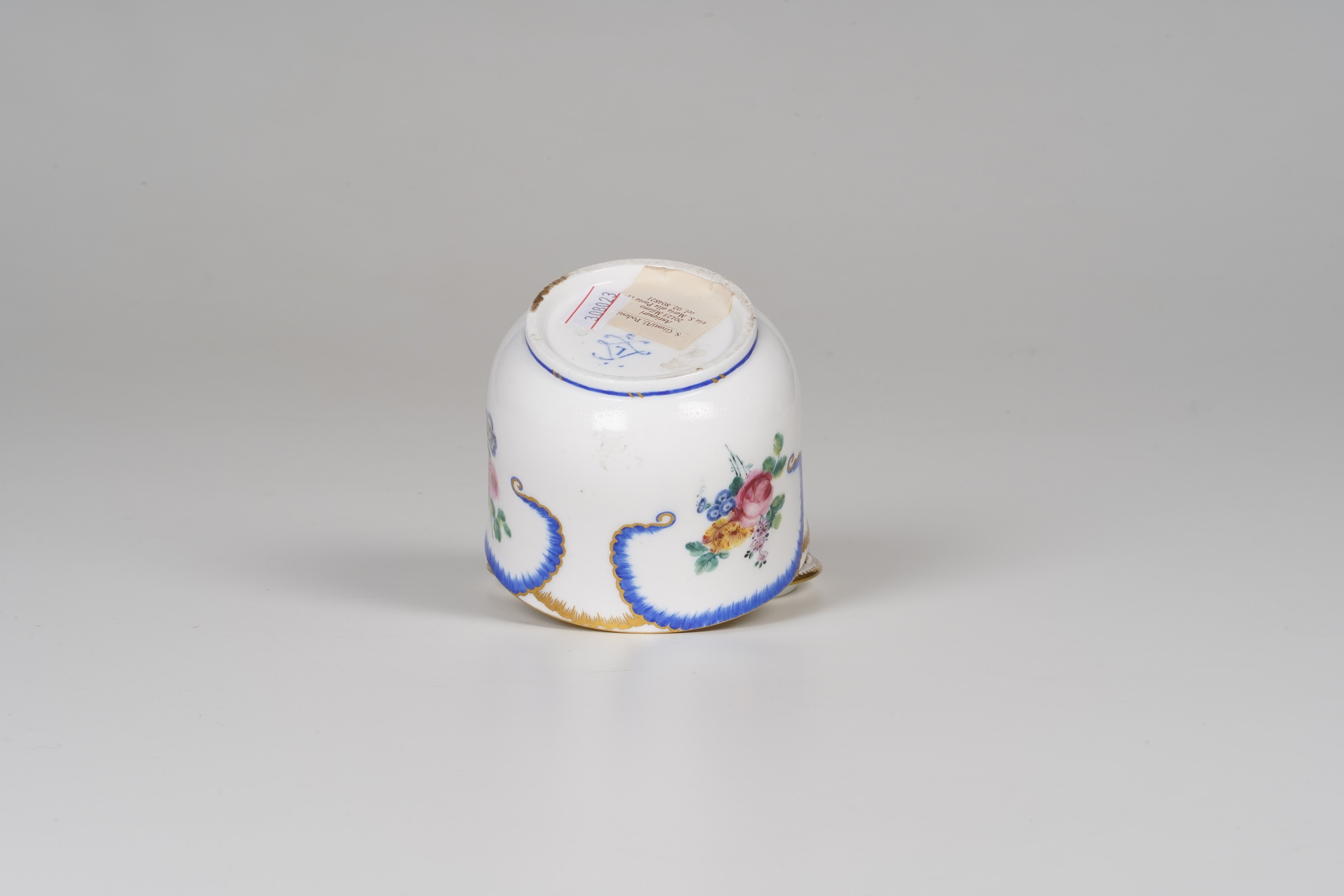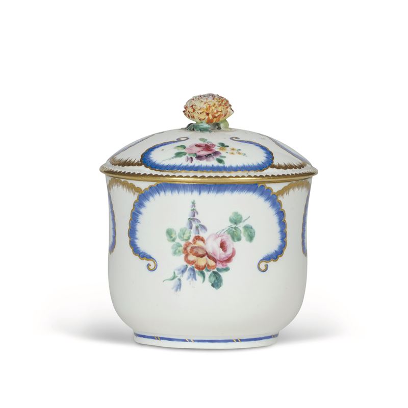 Il decoro è formato da mazzetti di rose e altri fiori incorniciati dal motivo detto “à feuilles de Choux” in oro e azzurro. Il bordo del coperchio presenta la tipica dentellatura in oro, mentre il piede ad anello è decorato con un sottile nastro blu con trattini in oro