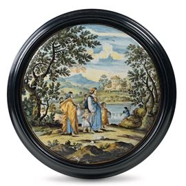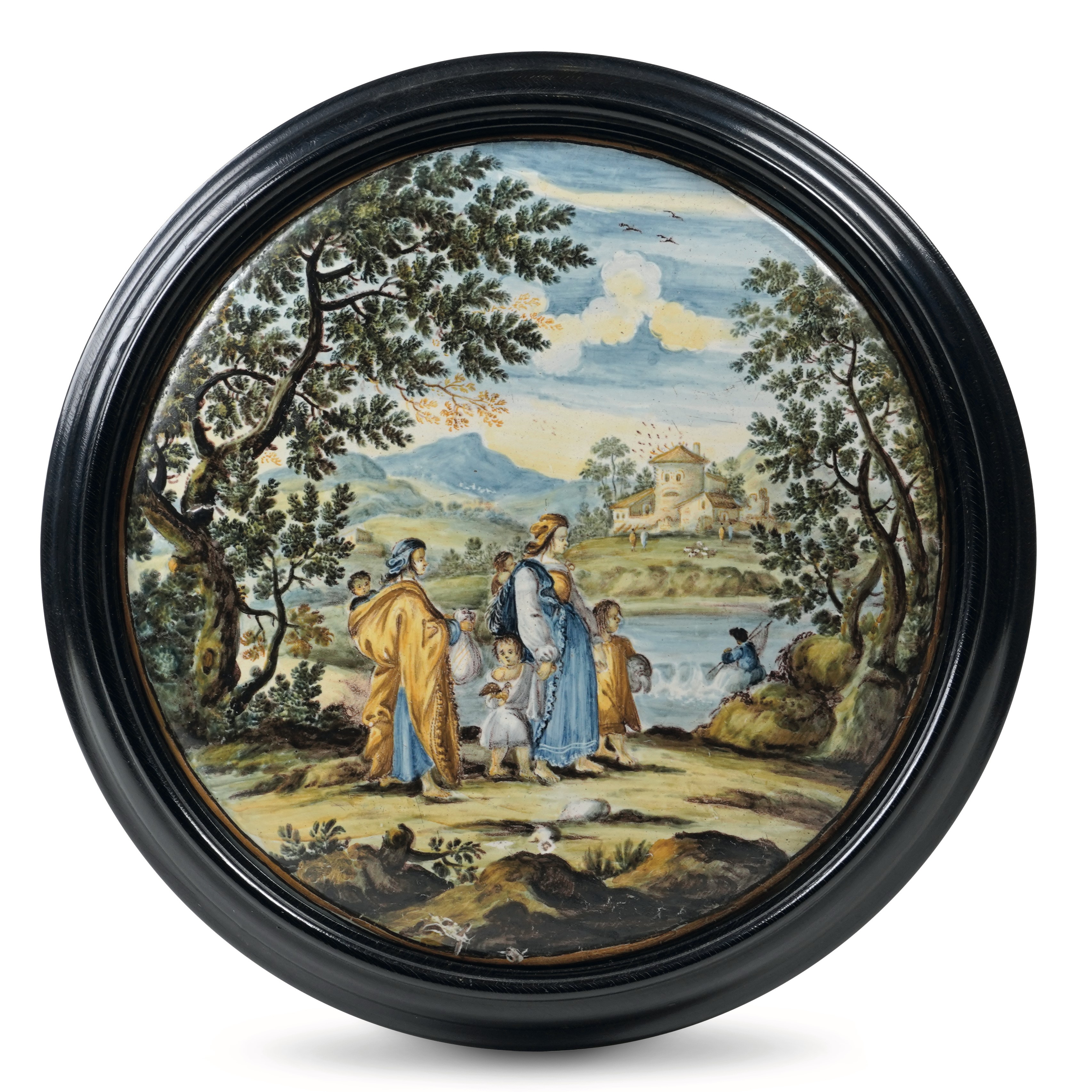 Tondo in maiolica decorato con una scena campestre che vede, in primo piano, due donne con i loro bambini che camminano in riva ad un fiume. Su una bassa cascata del fiume lavora un pescatore con delle reti. Il paesaggio del fondo è dominato da un casale con una torre e lontane montagne si profilano nel cielo. Due alberi dai tronchi sottili e frondosi incorniciano la scena.