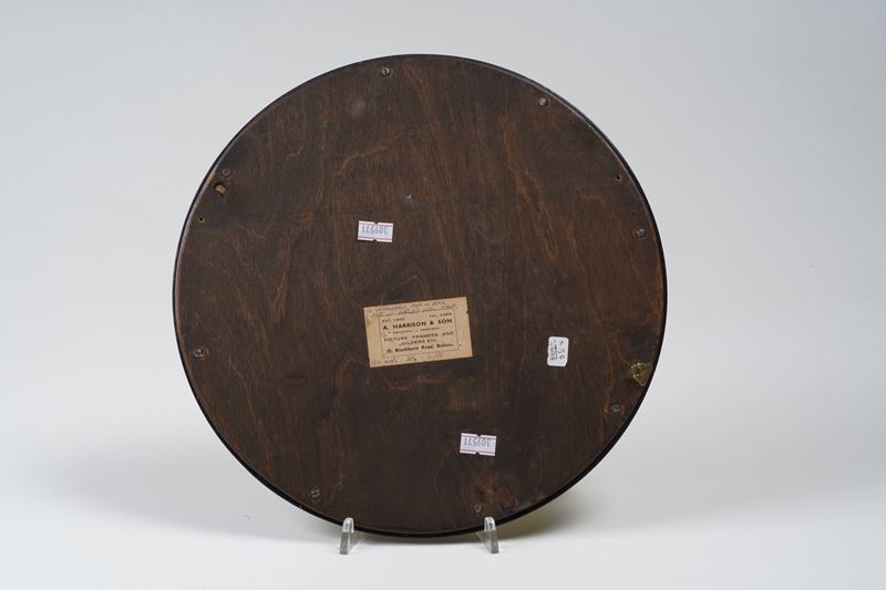 Maiolica. Diametro cm 25,3; diametro cornice cm 30,3. Conservazione: ottima. Cornice in legno moderna.