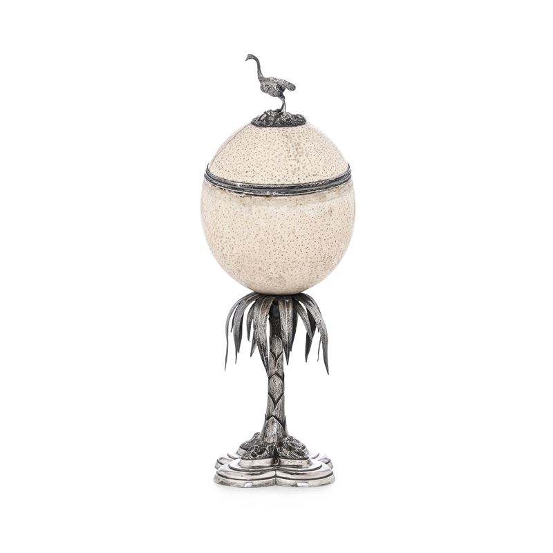 Argento fuso, sagomato e cesellato e uovo di struzzo