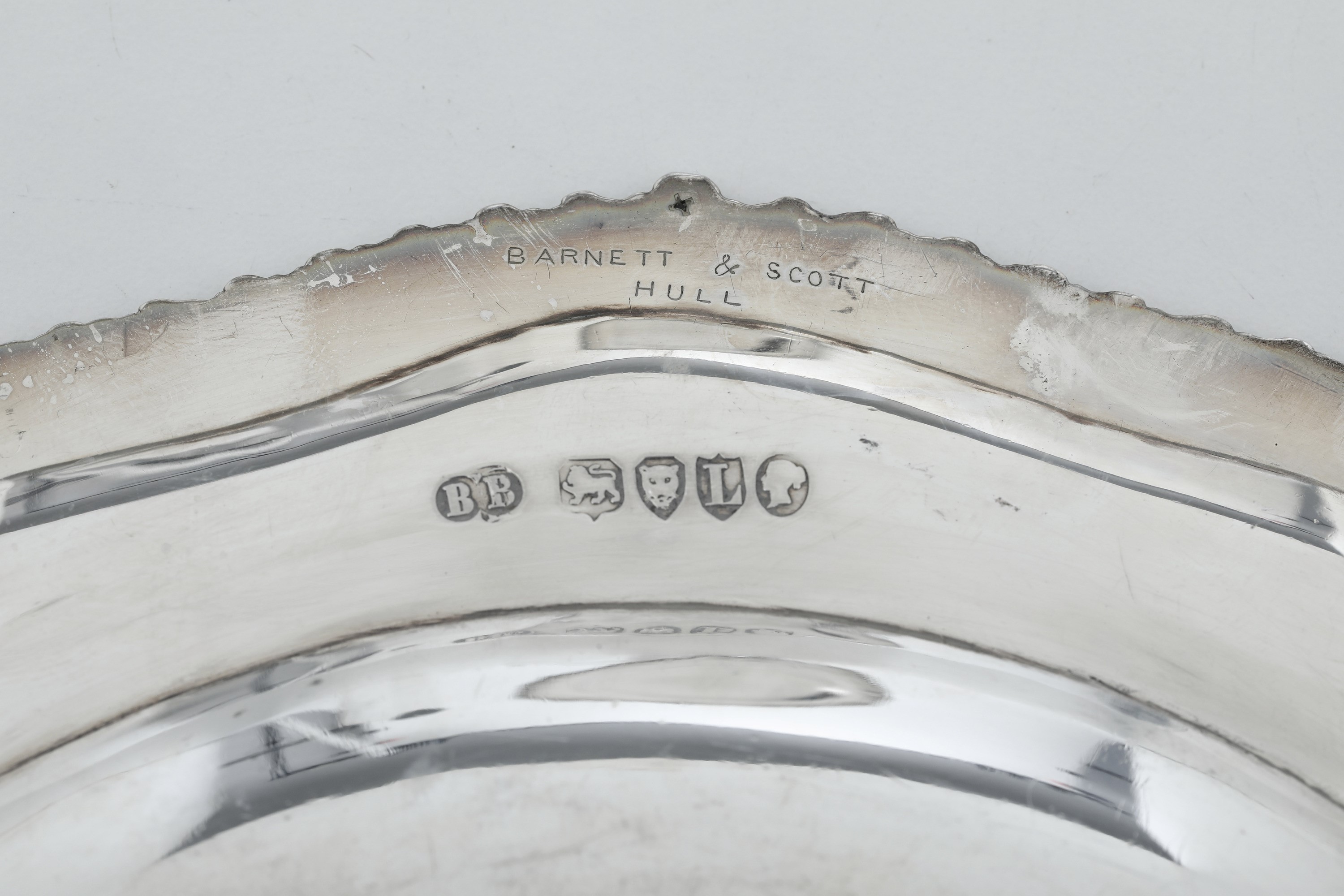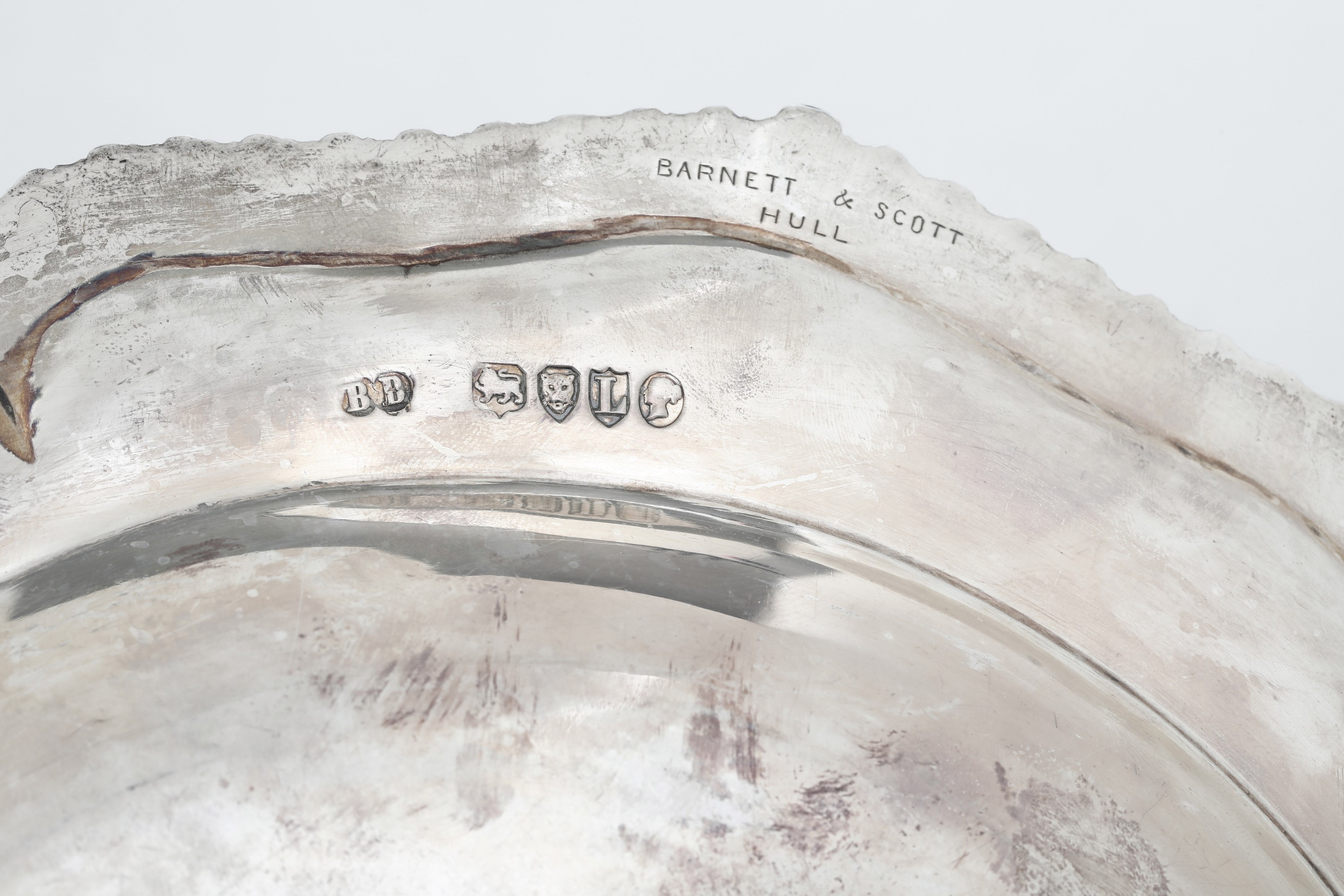 Bordo mistilineo, baccellato e crest inciso. Sotto il bordo incisa scritta "Barnett & Scott Hull"
