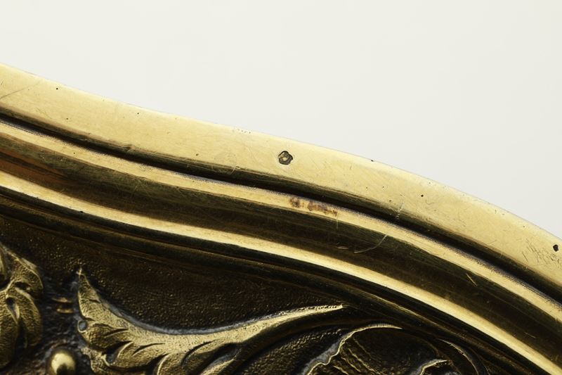 Bordo mistilineo con motivi a racemi e conchiglie, al centro grande decoro cesellato a fiore