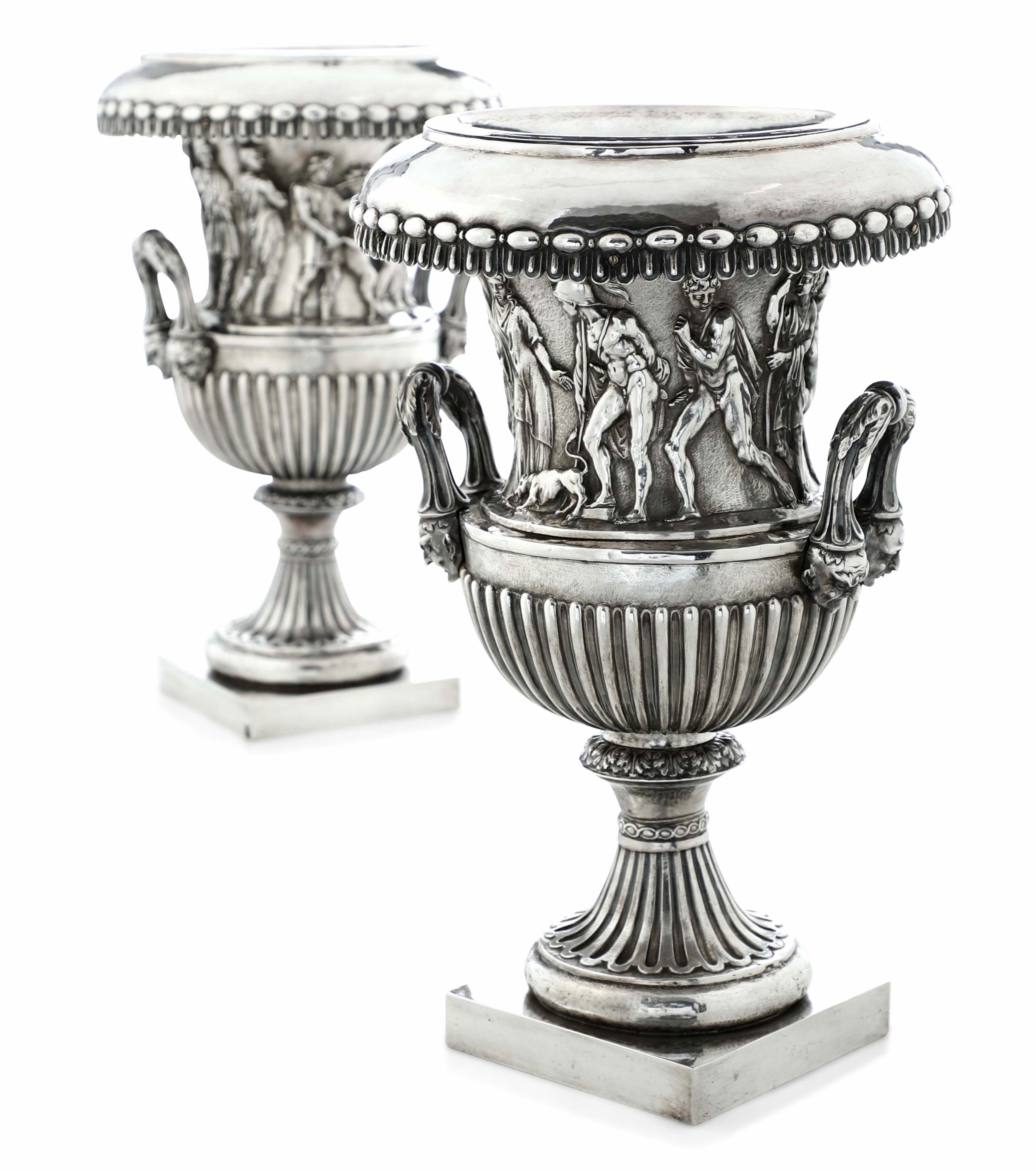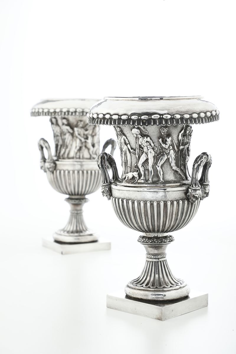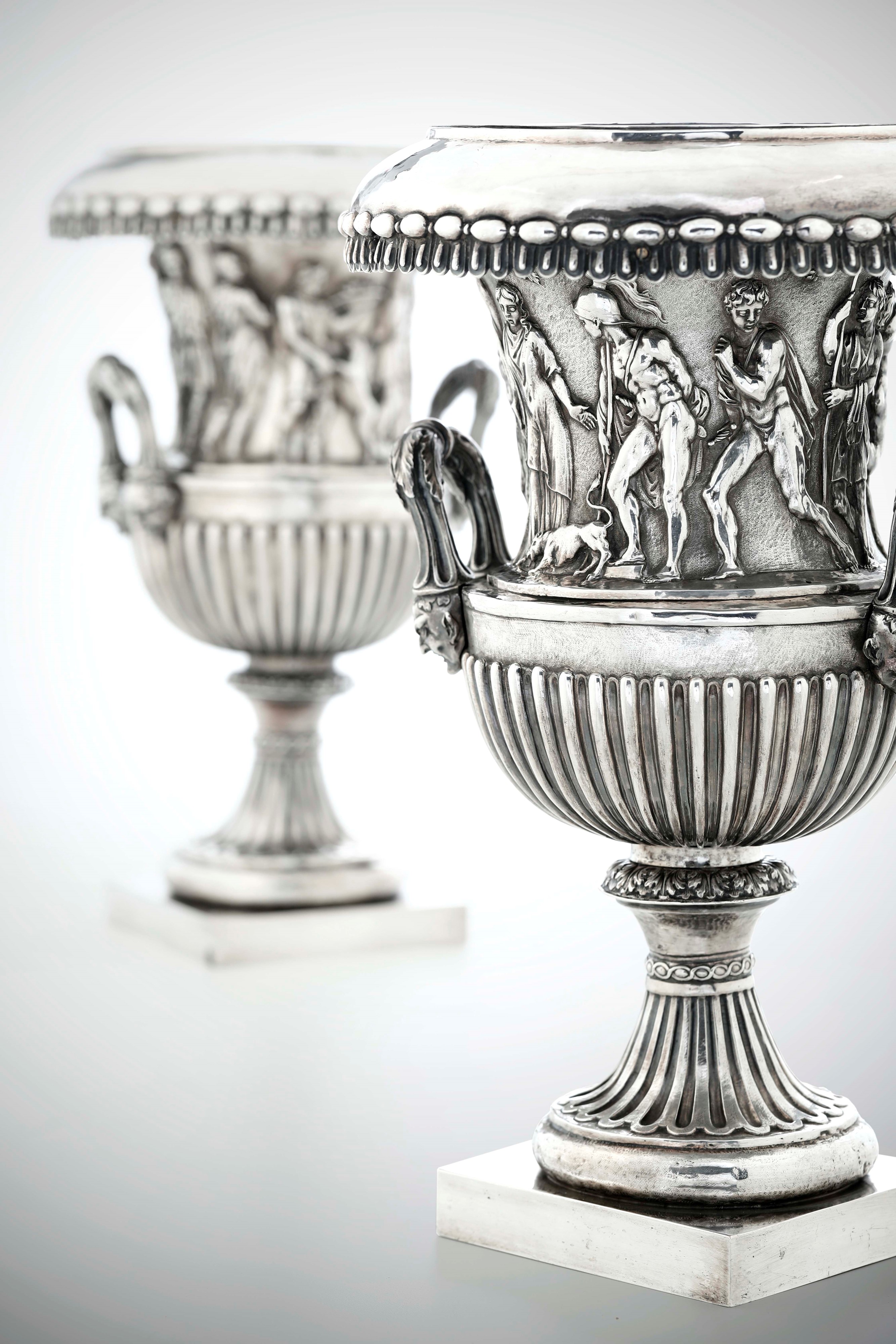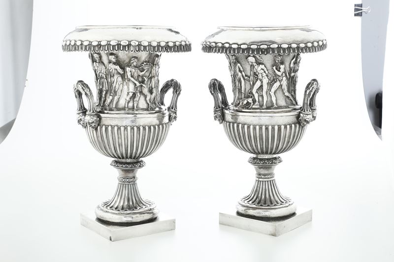 Eccezionale coppia di vasi "a cratere" di gusto classico, rara ed importante testimonianza di oggetti profani ad uso civile ispirati alla classicità antica, appartenenti alla produzione veneziana della prima metà del XVIII secolo magnificamente eseguiti a fusione, sbalzo e cesello con motivi decorativi rastremati, baccellati, dentellati e ad ovulo. Rafforzano questa evocazione stilistica le due fasce orizzontali con raffigurazione allegoriche di personaggi maschili e femminili che si susseguono sotto un pergolato di vite tra danze, libagioni e scene di festa in un iconografia chiaramente ispirata al mondo greco-romano. Eseguite con grande raffinatezza anche le anse laterali fogliate e rastremate che poggiano su teste di satiro aggettanti. I due vasi nel tempo sono stati oggetto di lavori atti ad adattare il contenitore interno con viti e supporti per renderli più stabili compresa la creazione della base a plinto quadrata sottostante. Antichi interventi che testimoniano l'importanza da sempre riconosciuta a questi due splendidi manufatti.