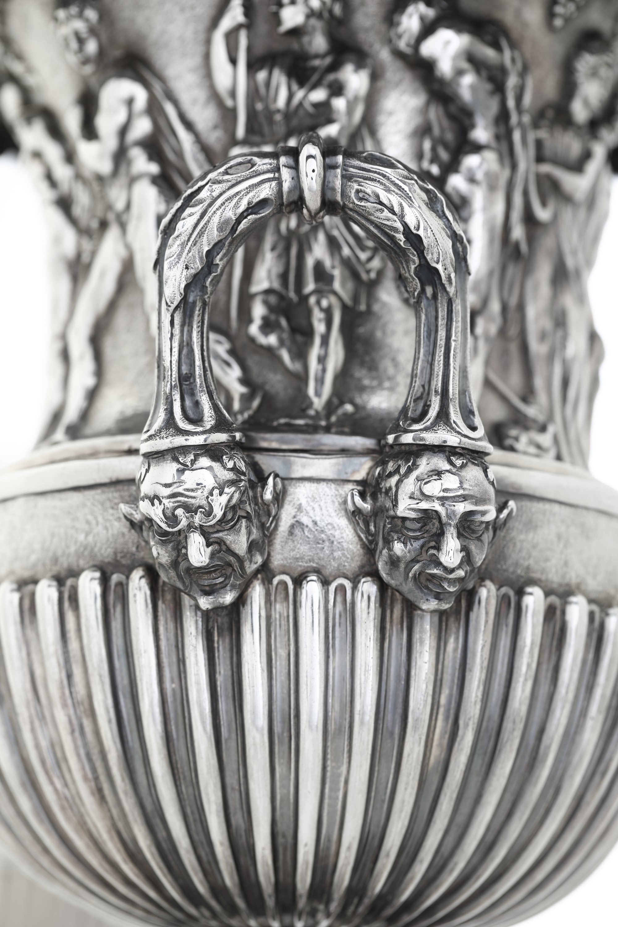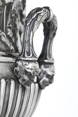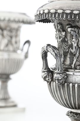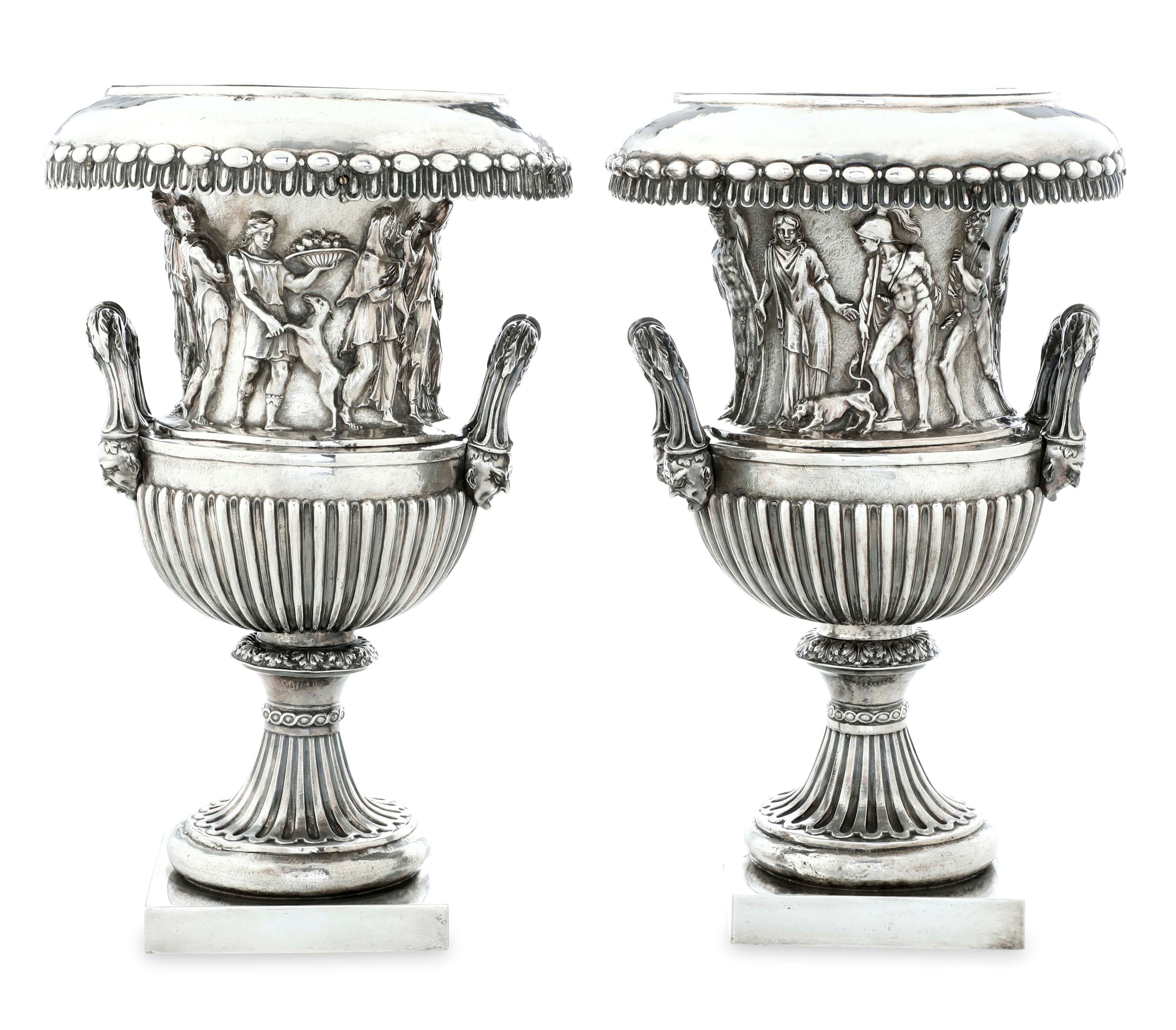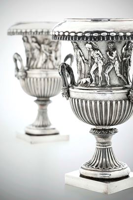 Eccezionale coppia di vasi "a cratere" di gusto classico, rara ed importante testimonianza di oggetti profani ad uso civile ispirati alla classicità antica, appartenenti alla produzione veneziana della prima metà del XVIII secolo magnificamente eseguiti a fusione, sbalzo e cesello con motivi decorativi rastremati, baccellati, dentellati e ad ovulo. Rafforzano questa evocazione stilistica le due fasce orizzontali con raffigurazione allegoriche di personaggi maschili e femminili che si susseguono sotto un pergolato di vite tra danze, libagioni e scene di festa in un iconografia chiaramente ispirata al mondo greco-romano. Eseguite con grande raffinatezza anche le anse laterali fogliate e rastremate che poggiano su teste di satiro aggettanti. I due vasi nel tempo sono stati oggetto di lavori atti ad adattare il contenitore interno con viti e supporti per renderli più stabili compresa la creazione della base a plinto quadrata sottostante. Antichi interventi che testimoniano l'importanza da sempre riconosciuta a questi due splendidi manufatti.
