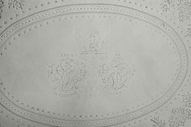 Eleganti decorazioni a perlinature e boccioli di gusto neoclassico. Piatto finemente cesellato con motivi a festoni e riserva ovale con monogramma e data