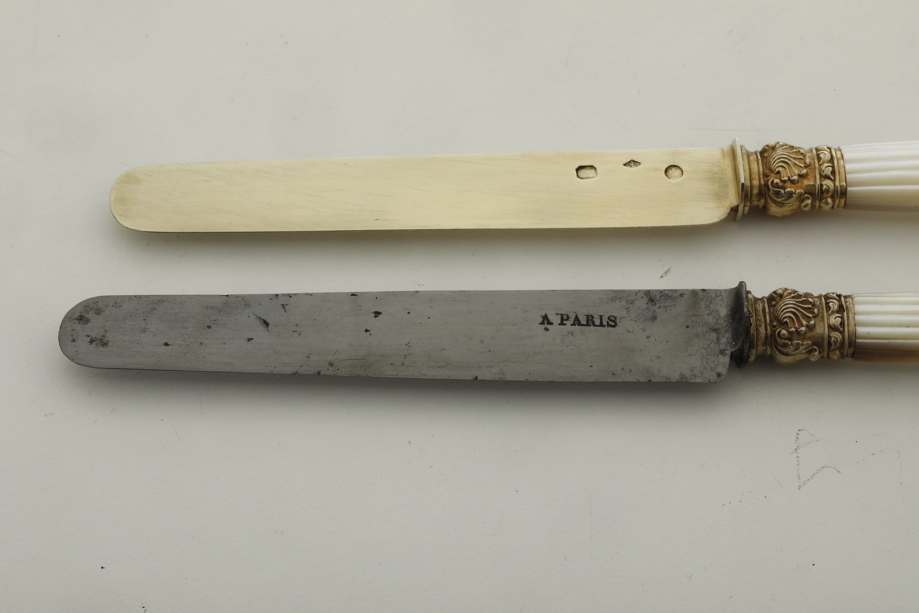 Manici sagomati e nervati con decori a volute e ventagli; coltelli con impugnatura in madreperla rastremata. Custodia originale