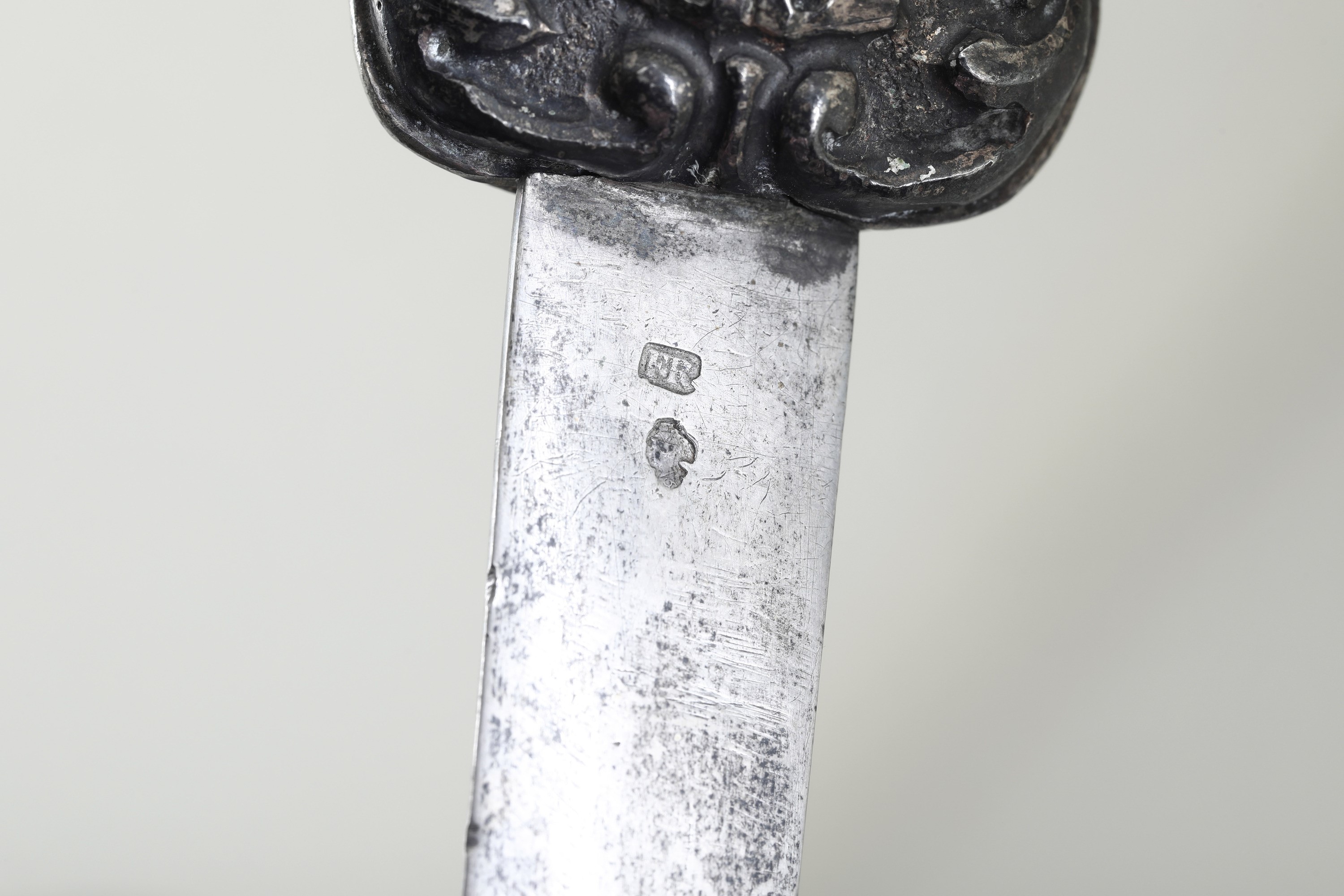 Impugnatura con decori a volute, fogliacei e riserva ovale con iscrizione