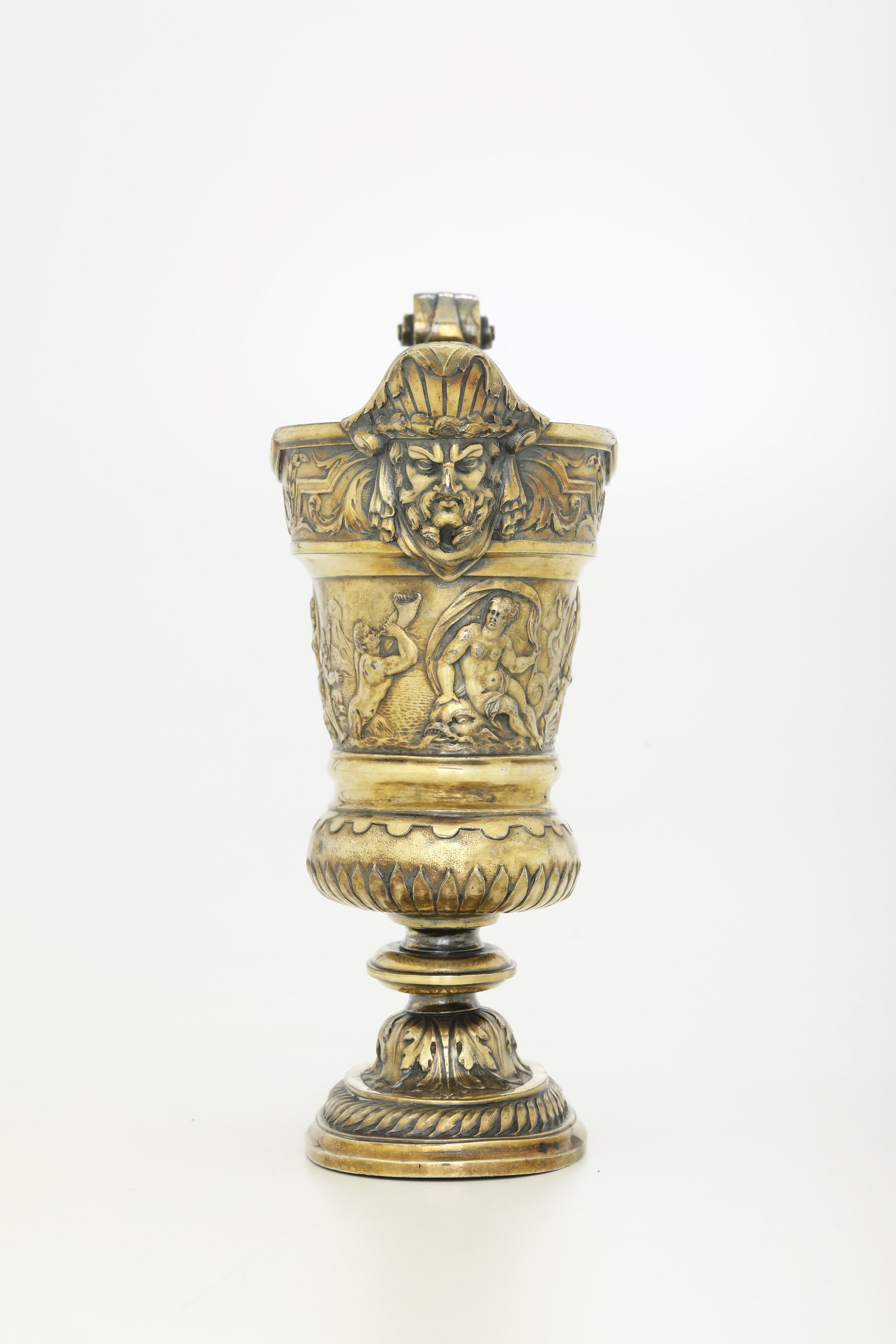 Corpo ad elmo rovesciato poggiante su piede circolare decorato a motivi fogliacei. Bocca sagomata nervata con alto beccuccio raffigurante mascherone e manico a volute sagomate. Al centro fascia orizzontale con scene mitologiche raffiguranti Poseidone e Anfitrite