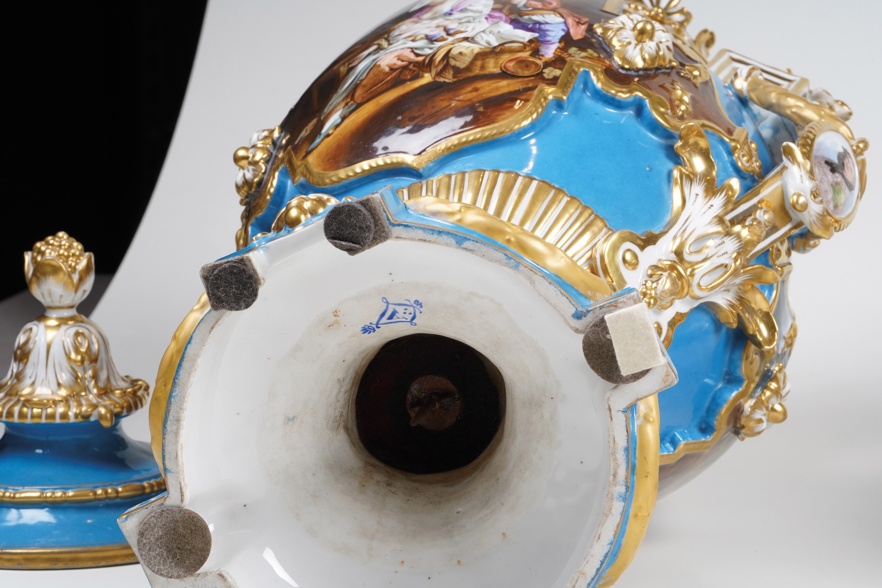 Porcellana. Marca: pseudo marca di Sèvres. Altezza cm 68. Conservazione: ottima; restauri minori alle rocailles (due su un vaso e quattro sull'altro); una presa del coperchio incollata
