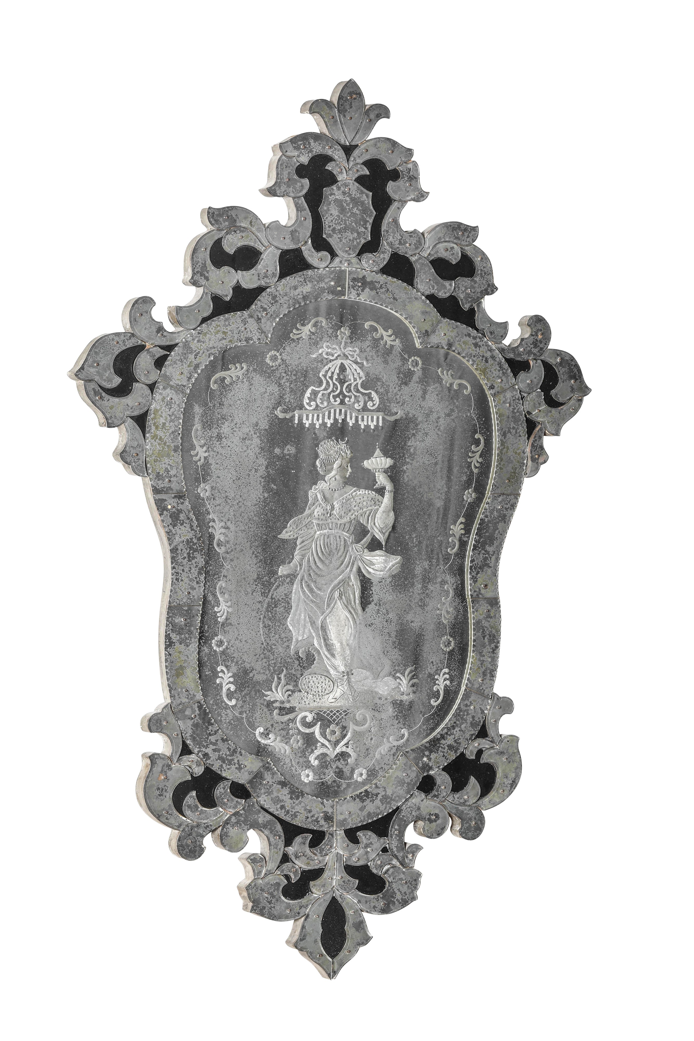 Forma polilobata, decori a riccioli e specchi incisi a figure mitologiche