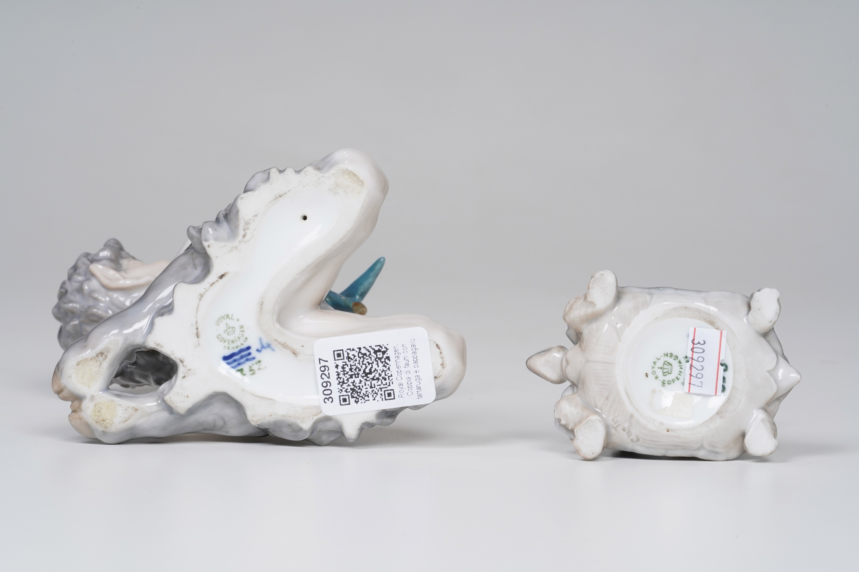 Porcellana. Marca: "Royal Copenhagen Denmark" in verde; onde in blu. Altezza cm 18; cm 9,5. Conservazione: coda del pappagallo restaurata e in parte mancante