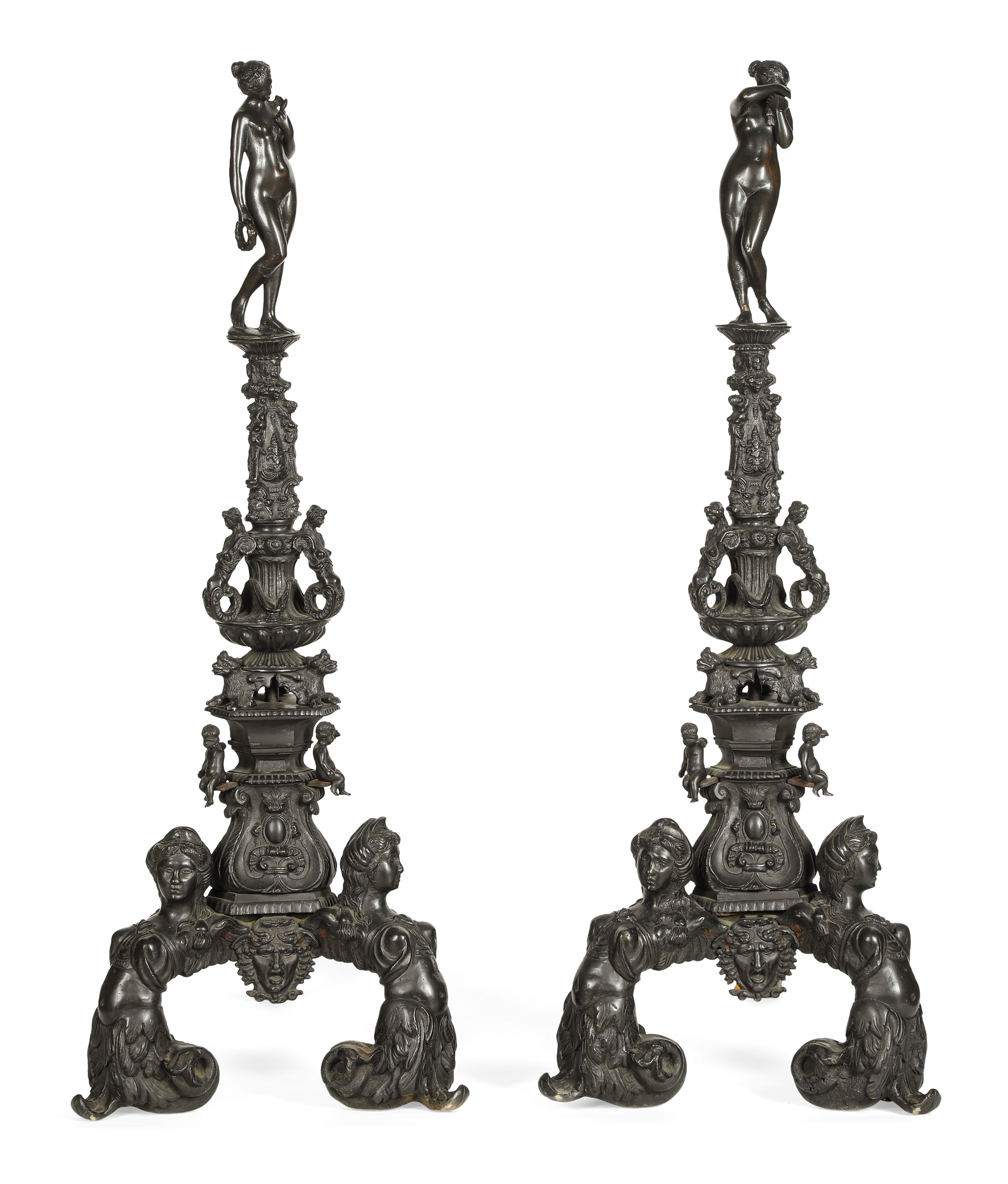 Monumentale coppia di alari. Fonditore italiano del XVIII secolo. Nei modi della scultura veneta tardo manierista prossima a Tiziano Aspetti (1559-1606)