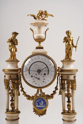 Cassa in marmo bianco scolpita a colonne sormontate da figure di amorini in bronzo dorato. Applicazioni, ghirlande e fregi in bronzo cesellato e dorato, placca centrale in porcellana. Quadrante firmato, con numerazione araba e romana, datario salterello, doppio movimento a gran suoneria per 12 e 24 ore. Base in marmo nero su piedini in bronzo