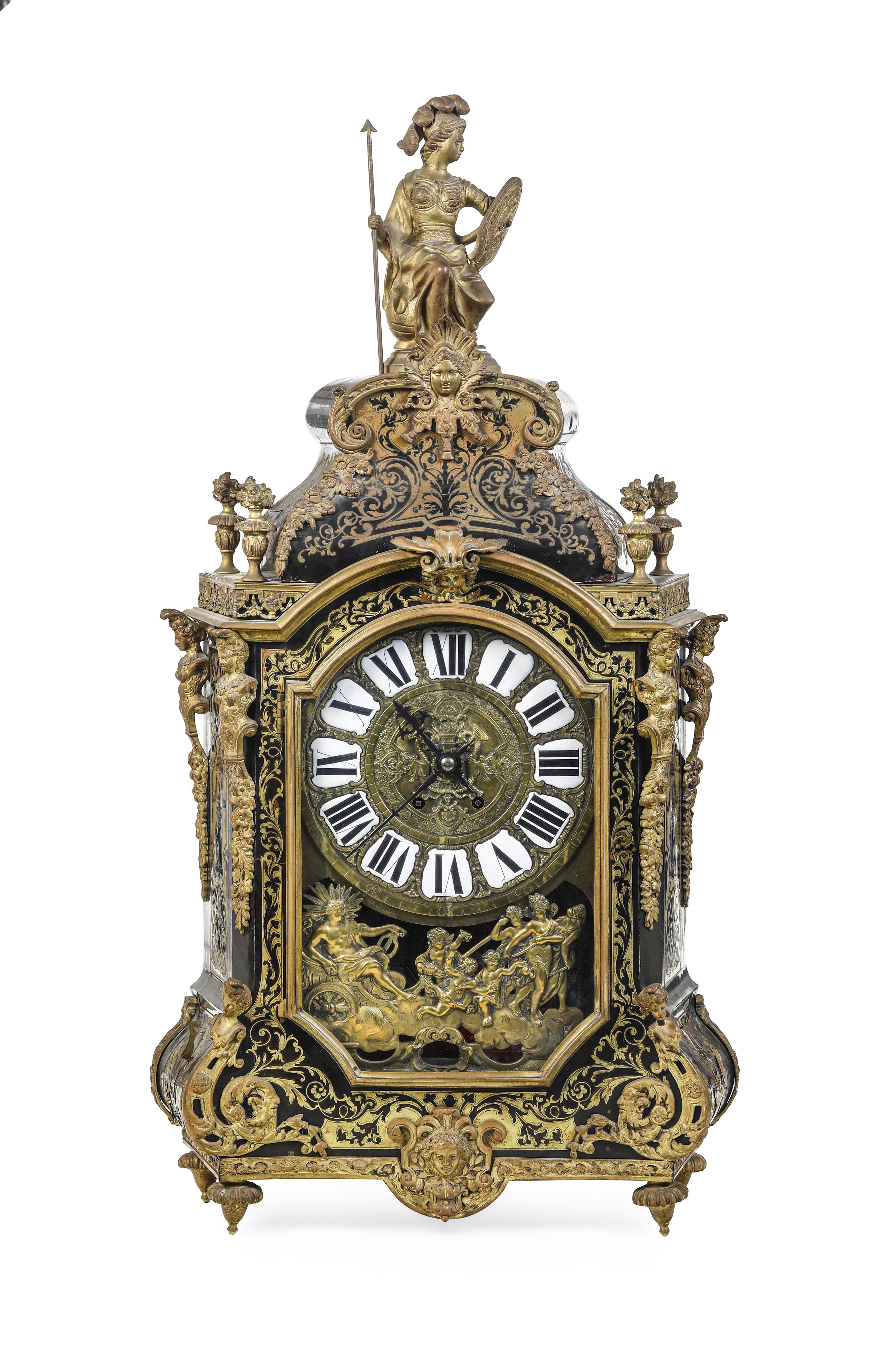 Cassa a marqueterie in stile Boulle sormontata da figura di Minerva, ricchi decori in bronzo, piedi a trottola. Quadrante a cartouches con numerazione romana per le ore