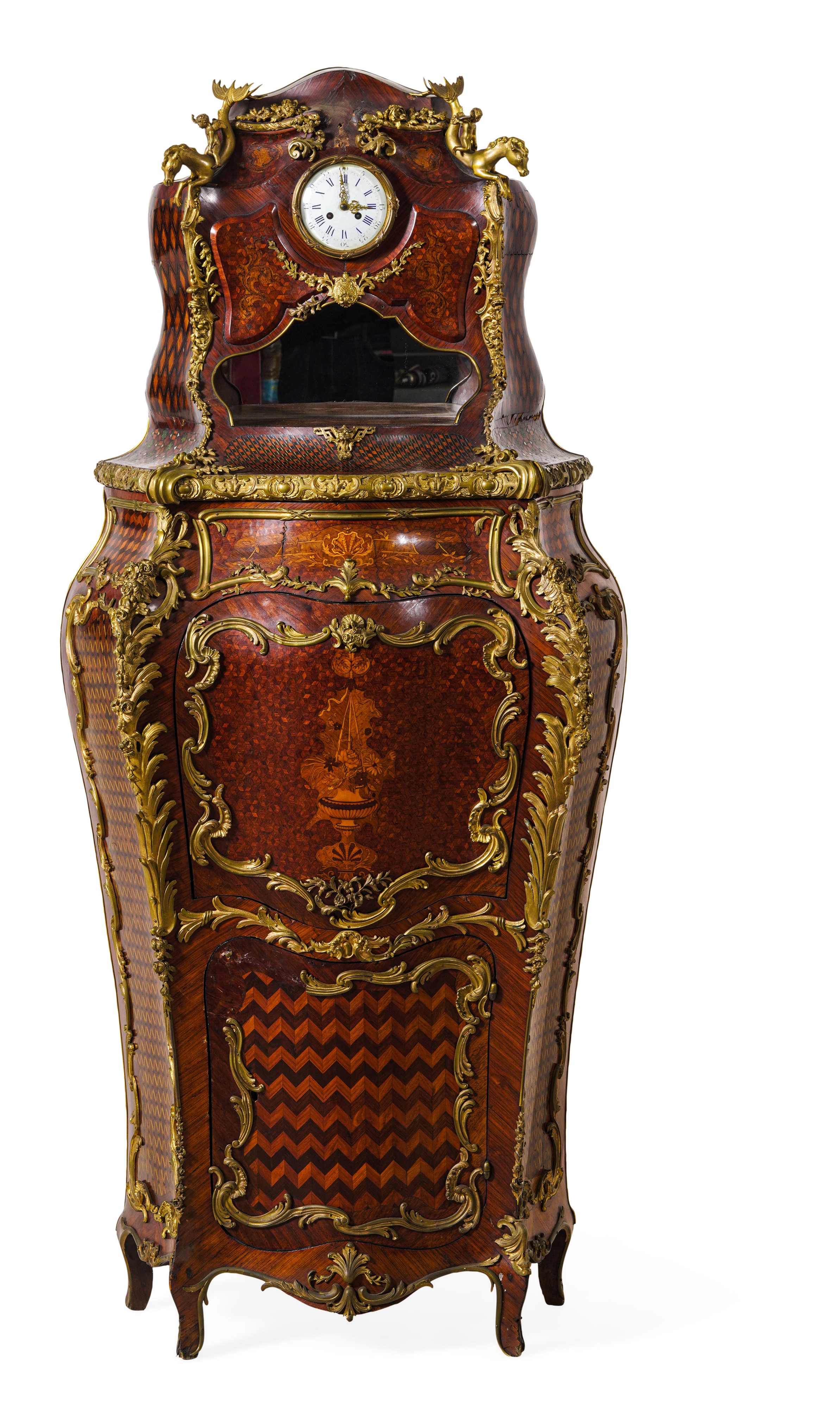 Forma mossa e bombata, fronte e fianchi incorniciati da ricchi decori in bronzo dorato a volute ed elementi rocailles, intarsi fitomorfi e a motivi geometrici