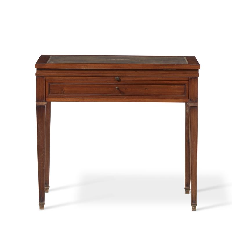 Piano reclinabile rivestito in pelle, cassetto nella fascia, due tiretti laterali, gambe troncopiramidali