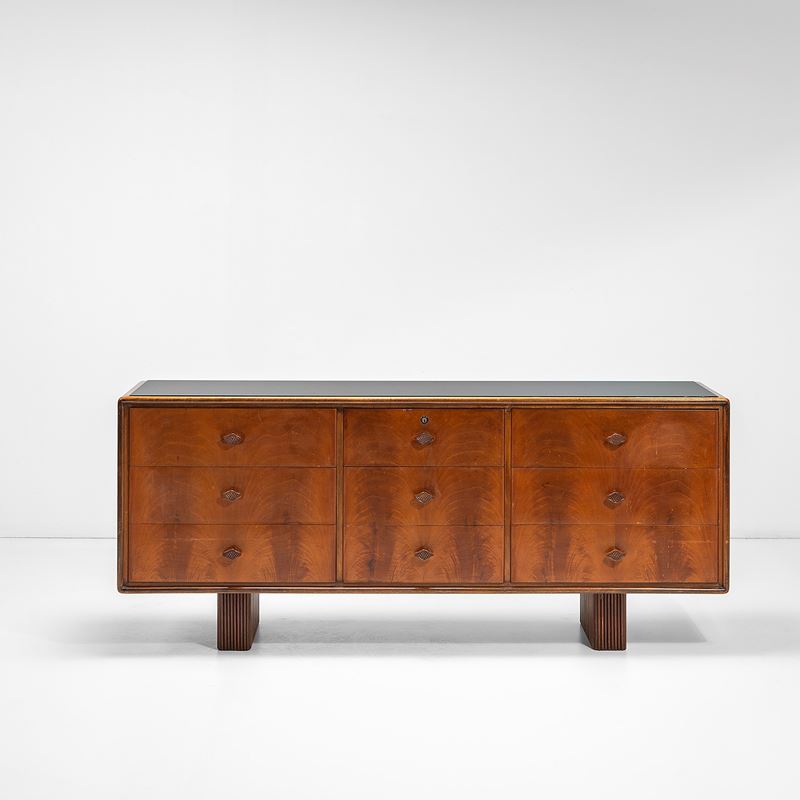 Struttura in legno e legno laccato a incorniciare i nove cassetti rivestiti in radica di Madrona. Piano in vetro. Sostegni con rivestimenti in legno grissinato. Maniglie in legno scolpito. Proveniente da una collezione privata.