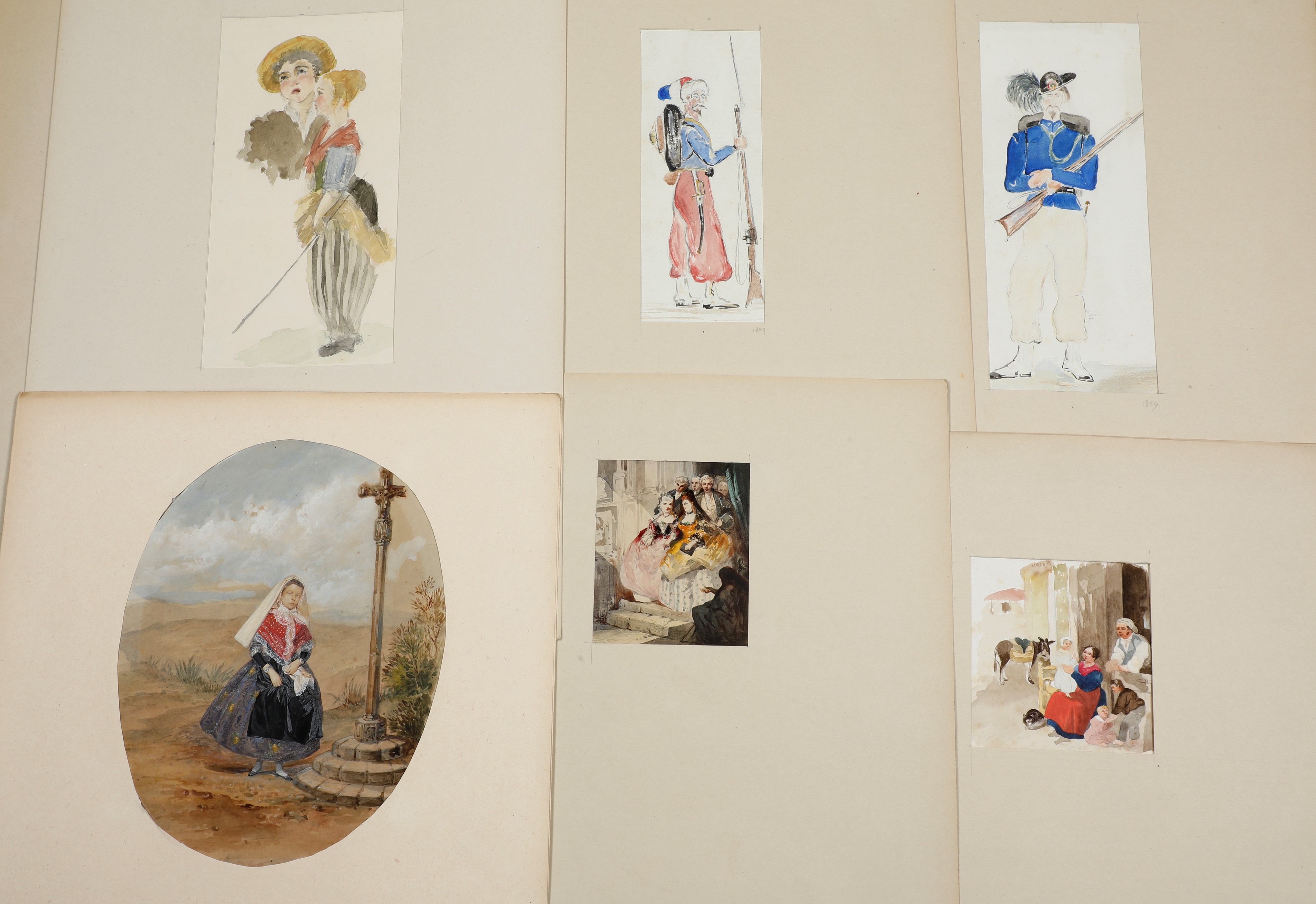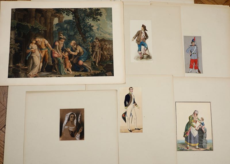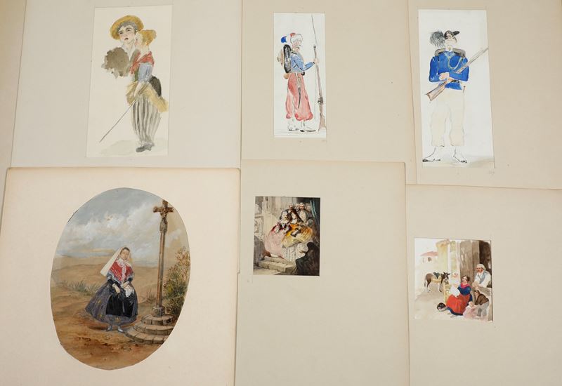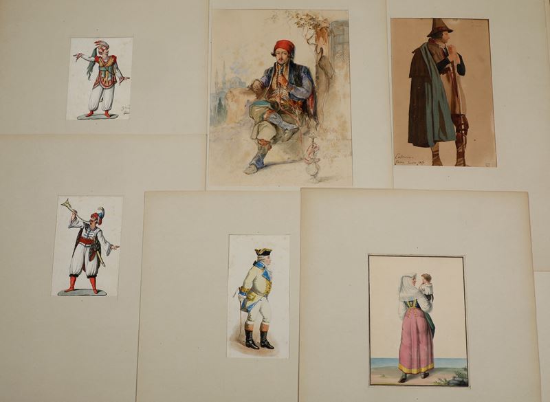 Cartella contenente 31 costumi acquerelli, tecniche varie