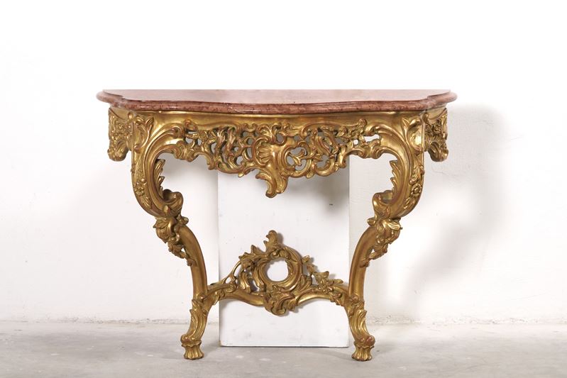 Coppia di consolles a goccia in legno intagliato e dorato. XX secolo