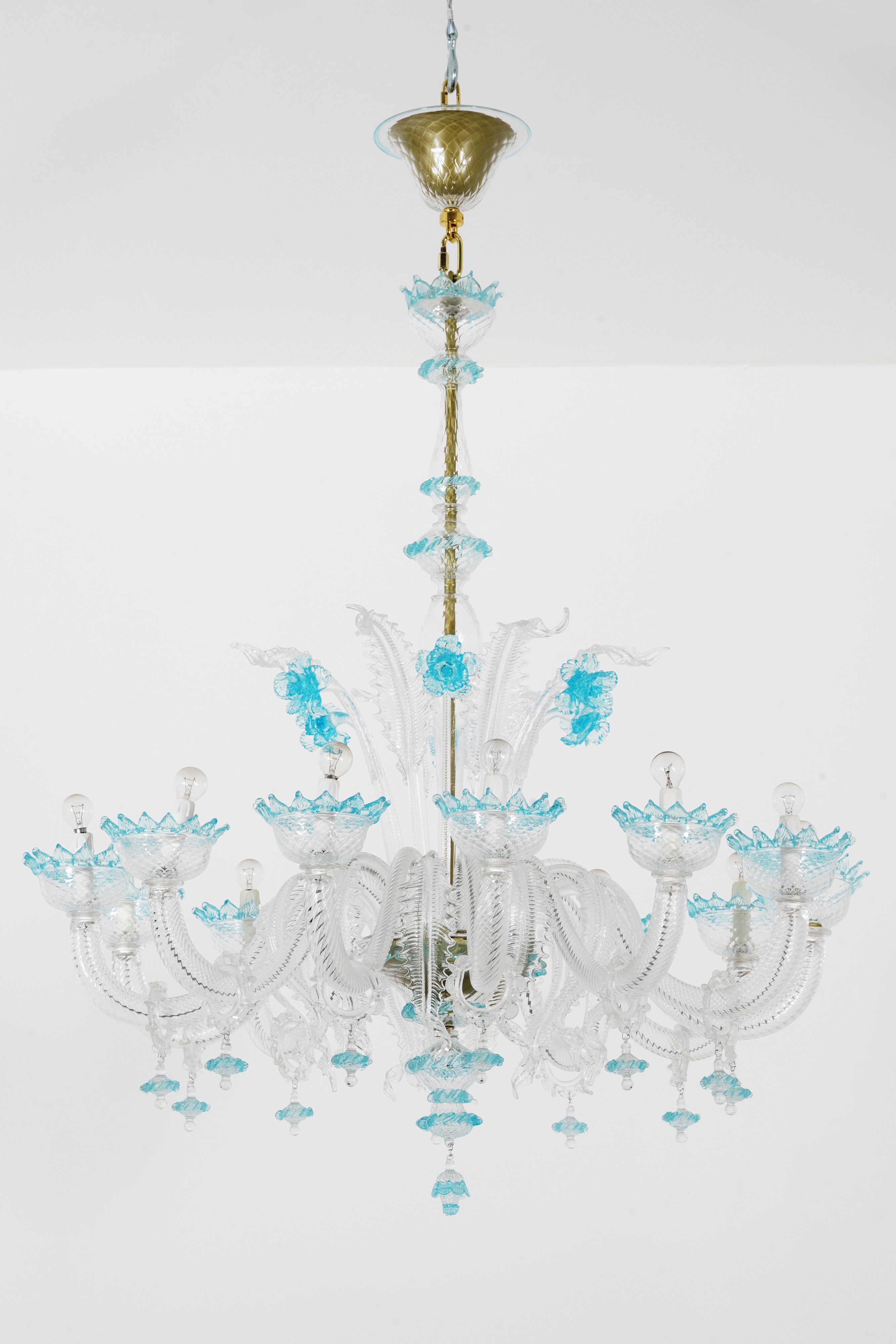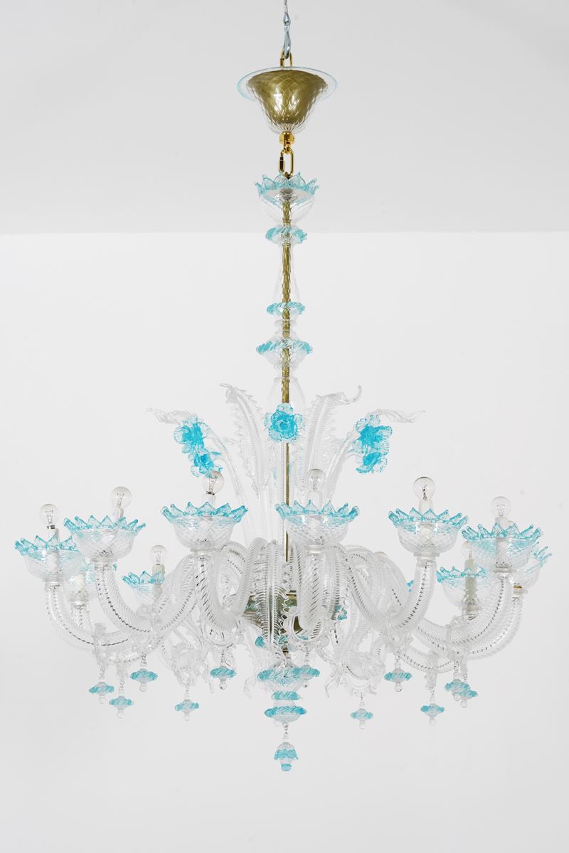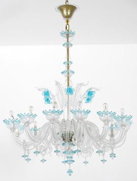 Lampadario a dodici braccia in vetro di Murano bianco e azzurro