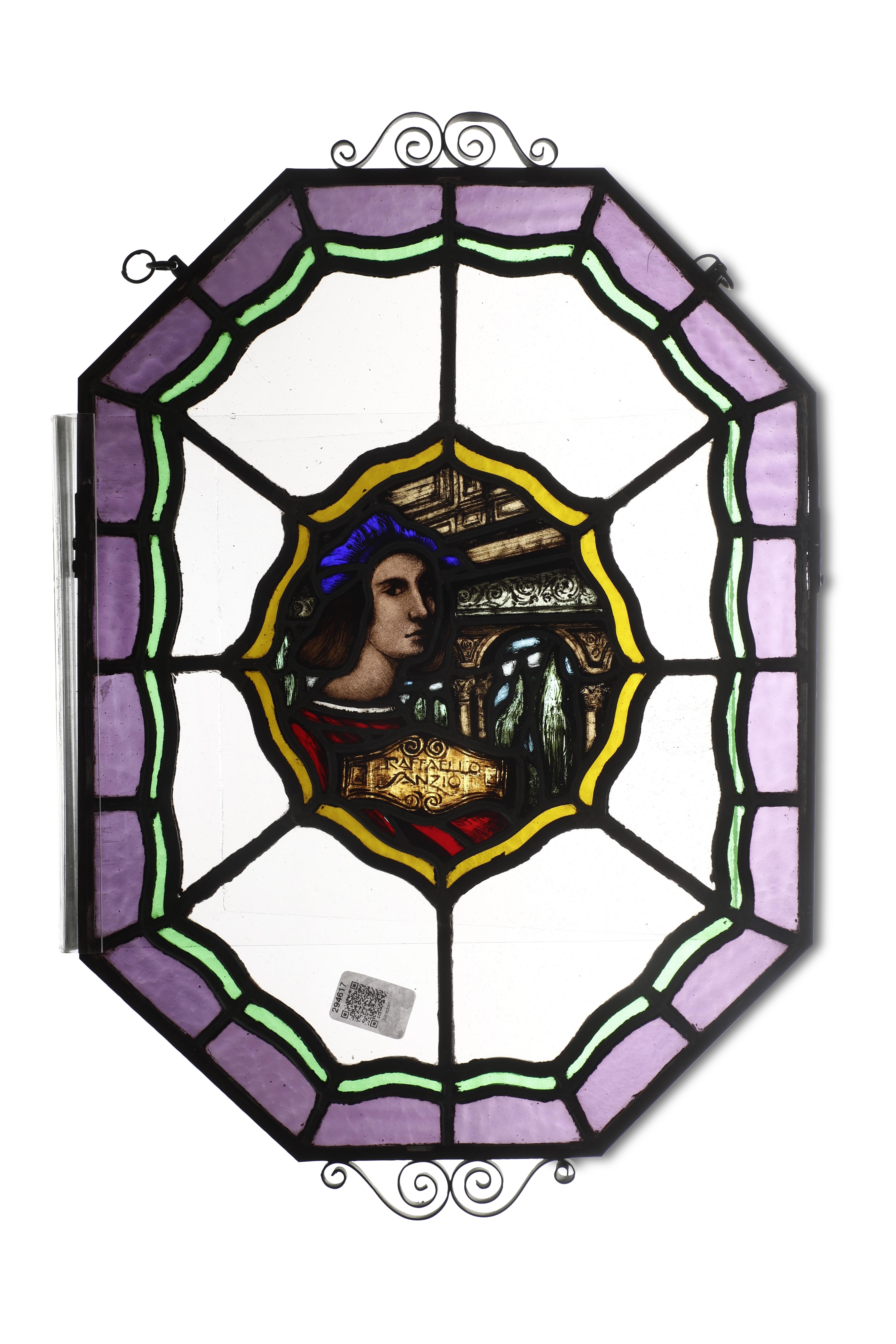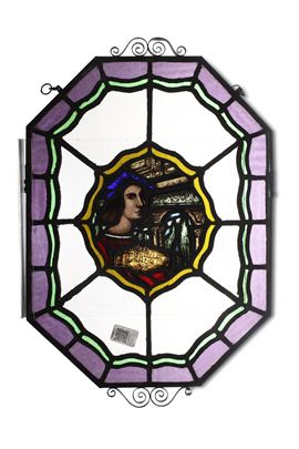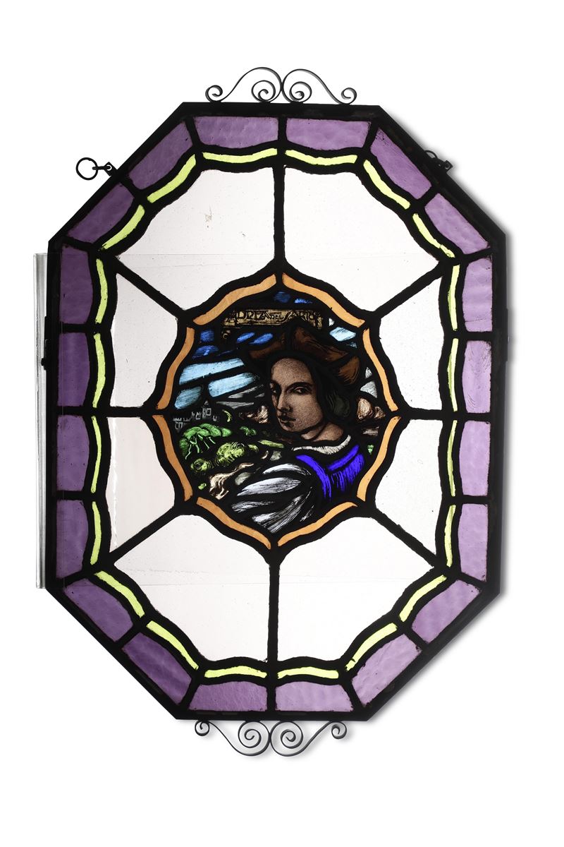 Coppia di vetrate dipinte con ritratto di Raffaello Sanzio e Andrea del Sarto. XX secolo