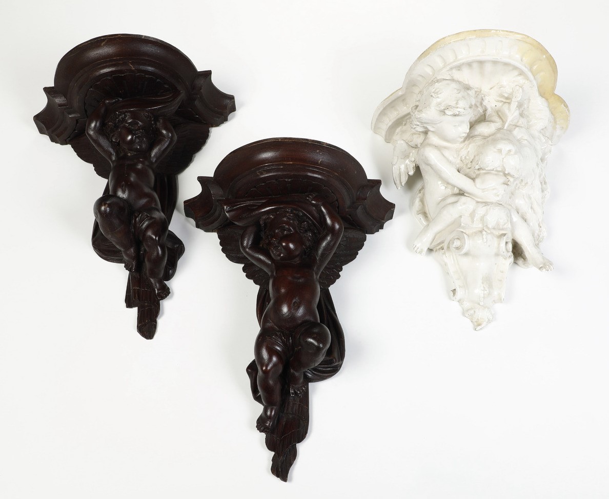 Tre mensole, una in maiolica e due in legno